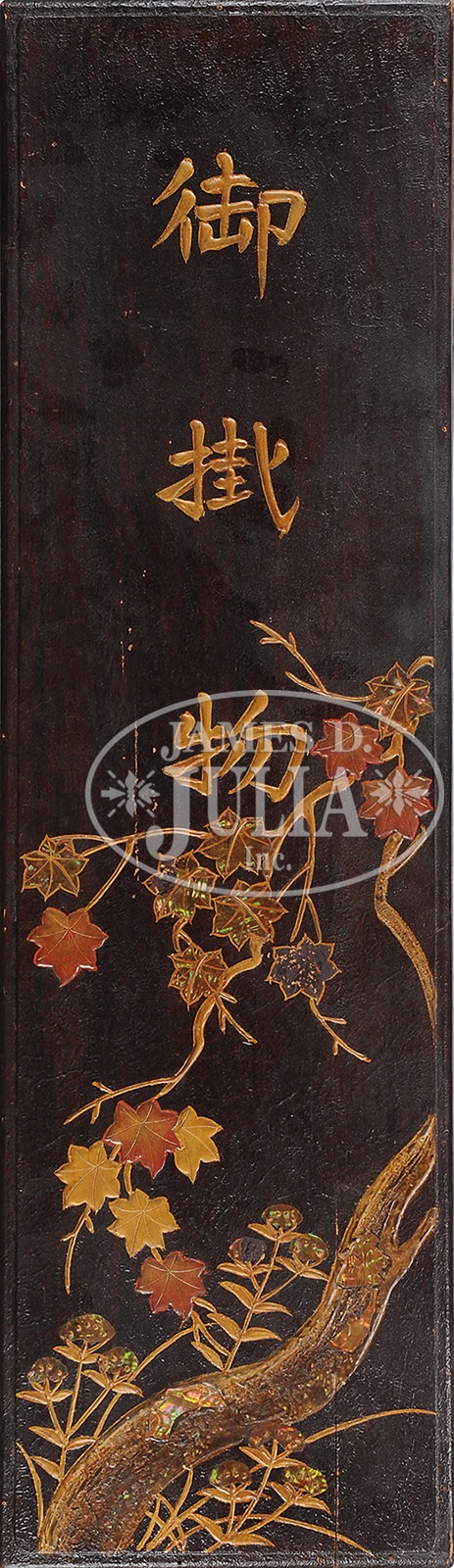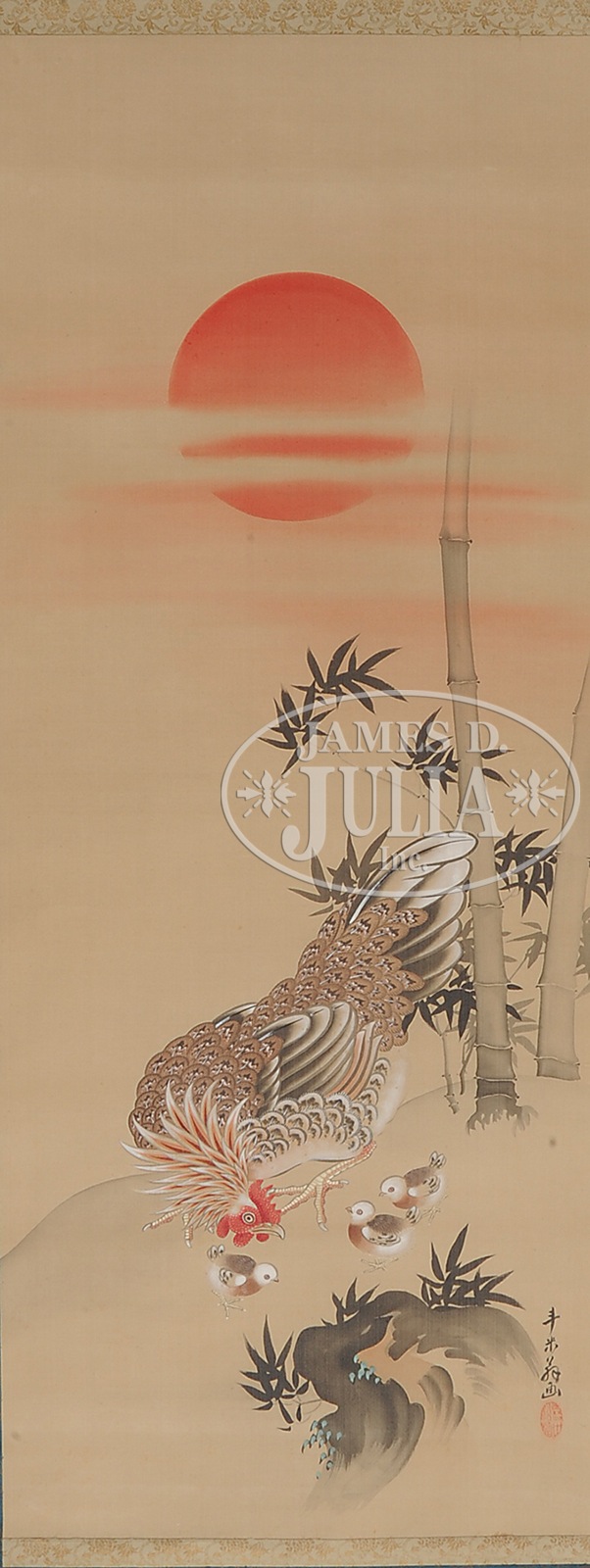 SET OF THREE JAPANESE PAINTINGS.Japan. The set includes three paintings, each painted with a different chicken in natural environments, all set into original wooden box. SIZE: 51-1/2″ h x 20″ w CONDITION: Good. 7-75206 (800-1,200) – Lot 2520