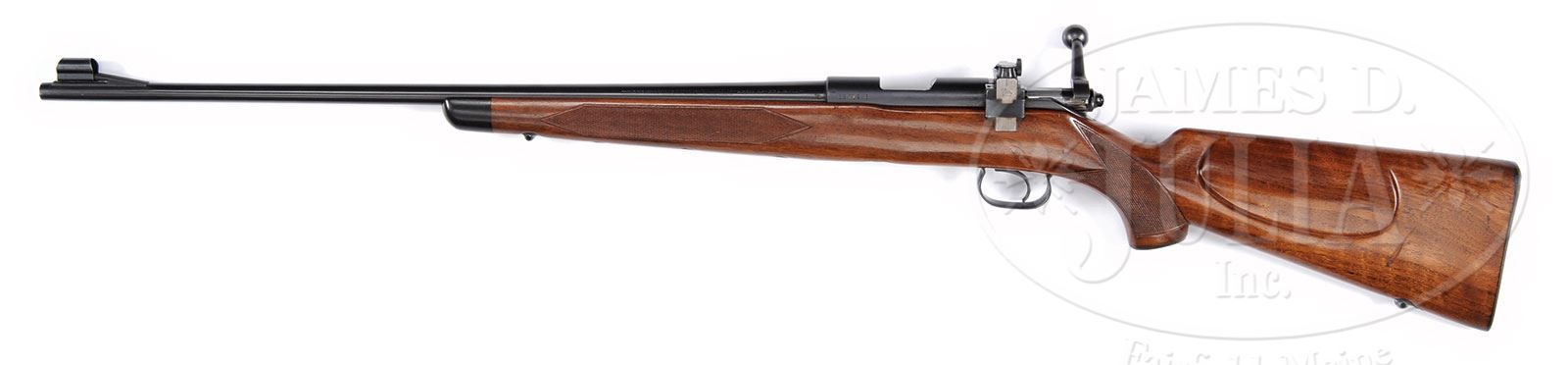 *SCARCE WINCHESTER MODEL 52B SPORTER BOLT ACTION RIFLE.SN 63712B. Cal. 22 LR. Beautiful Sporter with 24″ tapered rnd bbl, ramp front sight with hood, no provision for a rear sight and a Lyman receiver sight with micrometer adjustment knobs. Trigger guard is stamped sheet metal marked “SPORTING”. Mounted in very nicely figured American walnut half stock with black forend tip and triple diamond checkered forestock with capped pistol grip buttstock & cheekpiece with checkered steel Winchester buttplate. Buttstock & forestock have deluxe Winchester sling swivels containing an orig Winchester marked leather sling. Also accompanied by one orig 5-rd magazine. These rifles, in five different series, were produced from 1934 until 1958. These beautiful rifles usually saw service both in the field and on target ranges and generally show moderate to heavy wear. Crisp examples are very rare. CONDITION: Extremely fine. Metal retains about 99% crisp orig blue with only faint thinning on the muzzle edge. Stock has a scrape on the left side back of the cheekpiece and a couple of minor nicks and overall retains most of its orig factory varnish. Mechanics are crisp, brilliant shiny bore; shows very little use. 4-56155 (4,000-7,000) – Lot 2521