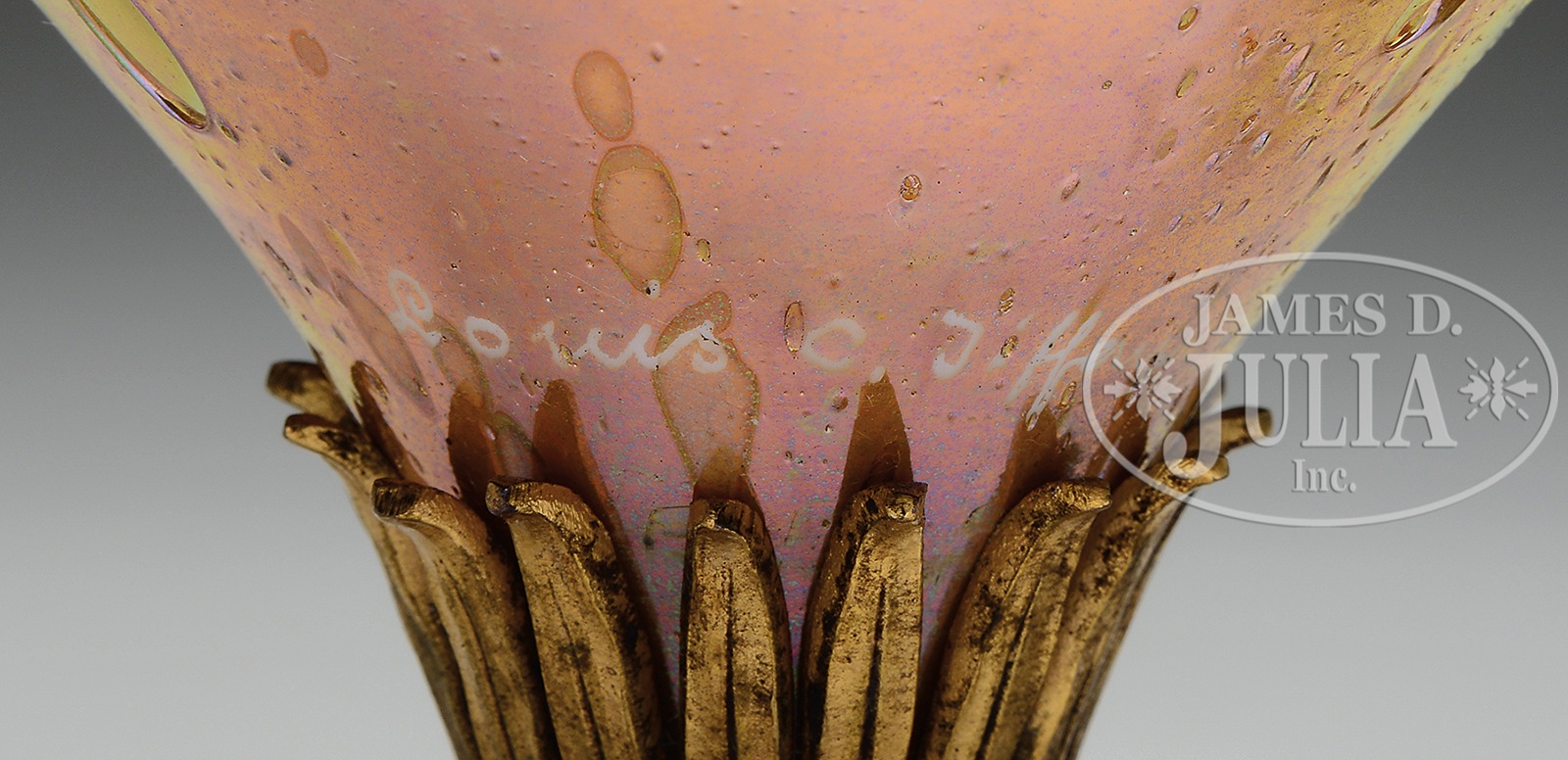 TIFFANY STUDIOS CYPRIOT LAMP BASE WITH SILK SHADE.Tiffany studios cast bronze lamp base has floral border around edge of the foot with stylized leaves holding the Tiffany Cypriot glass shaft. Shaft is topped with a bronze cap and stem leading to a two-socket cluster. The Cypriot shaft has bright gold iridescence with flashes of green and pink. Lamp is finished with a white pleated silk shade. Metal is finished in gold and gold dore. Metal is unsigned. Shaft signed on the side “Louis C. Tiffany-Favrile”. SIZE: Lamp is 25″ t. CONDITION: Very good to excellent. 5-68871 (2,500-3,000) – Lot 2523