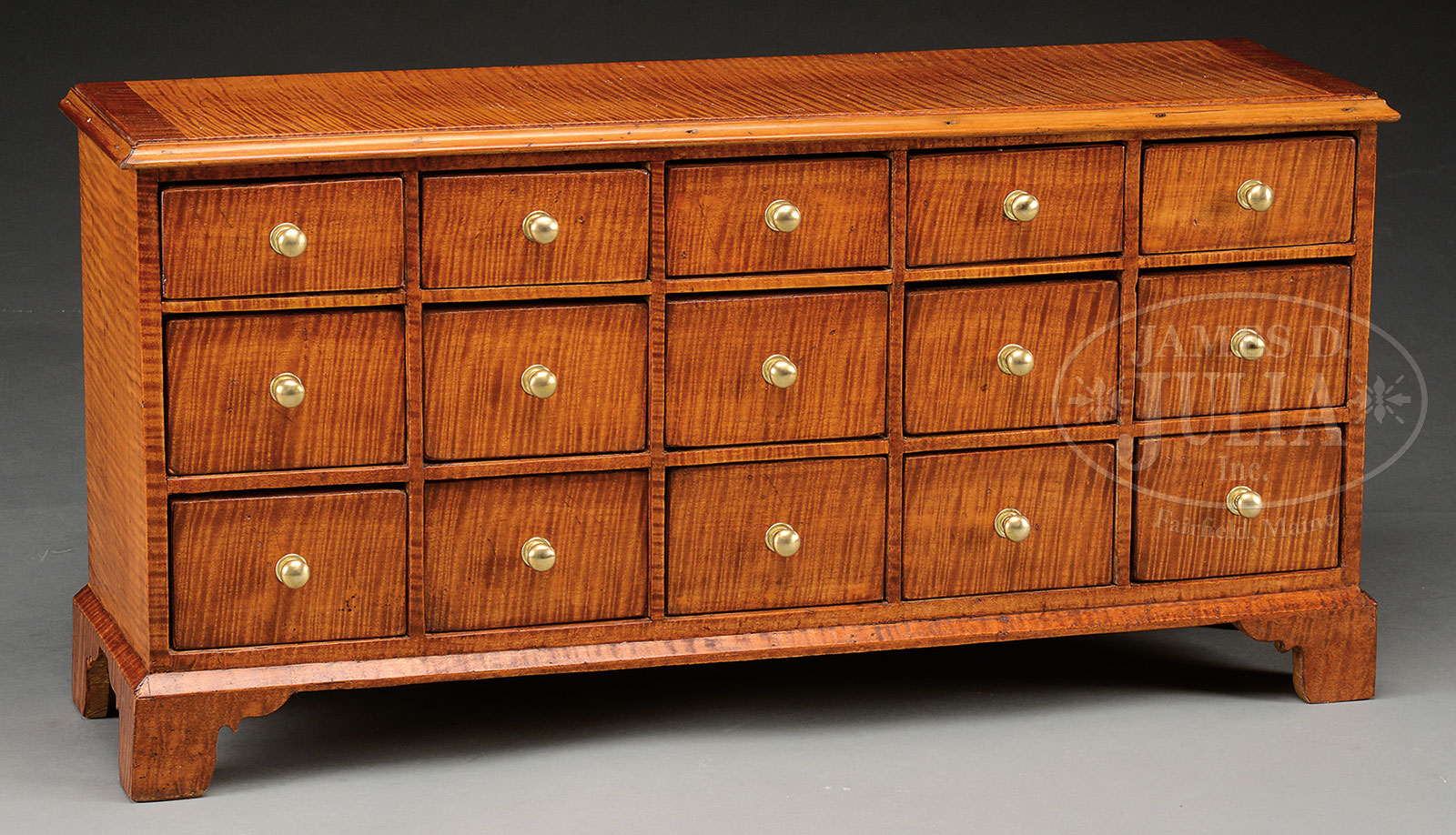 DIMINUTIVE TIGER MAPLE APOTHECARY CHEST.Late 19th century, America. The rectangular case with molded edge above the conforming case fitted with five banks of three drawers on a molded plinth raised on bracket feet with scalloped returns. The whole with bold tiger maple veneers. SIZE: 16-1/2″ h x 34″ l x 9-1/4″ d. CONDITION: Fully restored with professional polished surface. 51911-49 (2,500-3,500) – Lot 2525