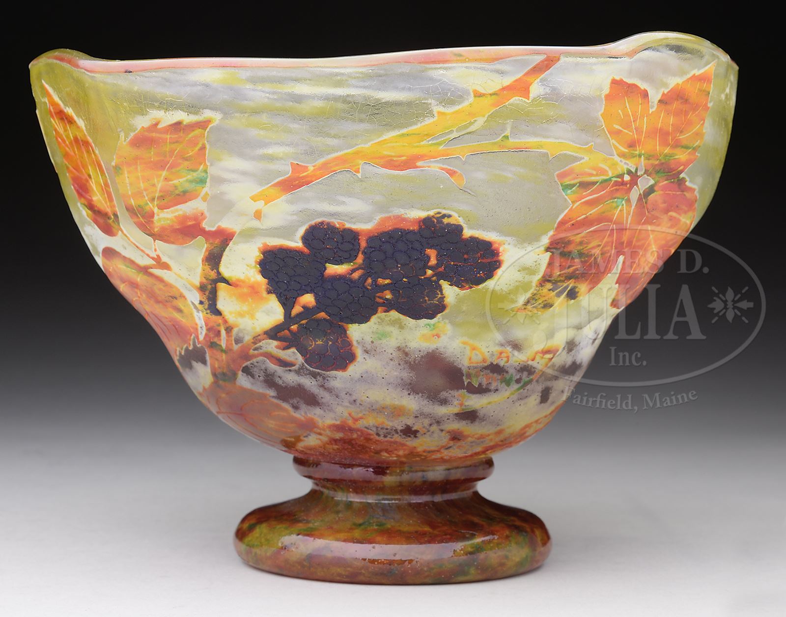 DAUM FOOTED CAMEO BOWL.Daum bowl has vitrified glass cameo decoration of blackberries, stems and leaves all set against a mottled internally decorated background. The bowl is signed on the side in cameo “Daum Nancy” with a cross of Lorraine. SIZE: 7-1/2″ dia x 5-1/4″ t. CONDITION: Very good to excellent. 50380-2 (1,750-2,250) – Lot 2527