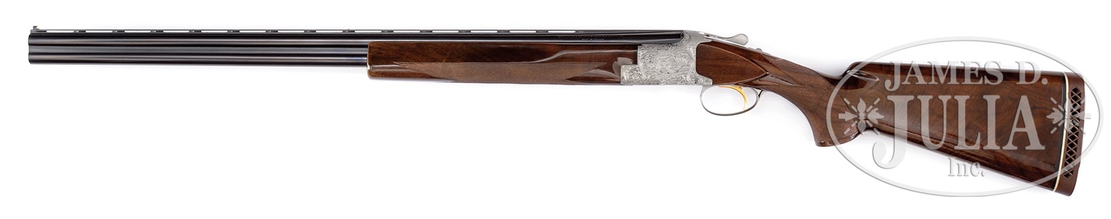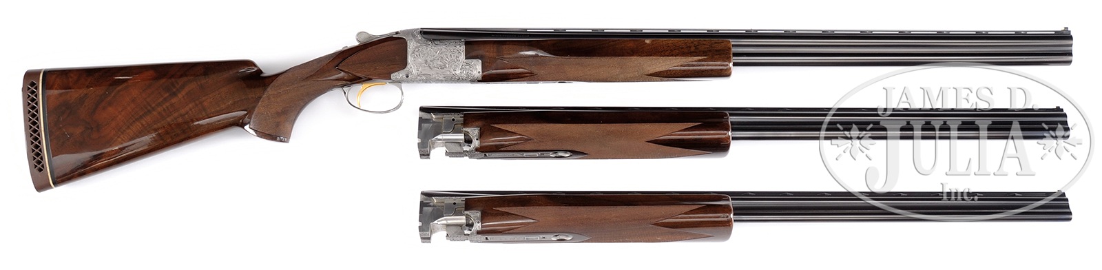 *BROWNING DIANA THREE GAUGE SKEET SUPERPOSED SET.SN 63191V71. Cal. 20 ga, 2-3/4″ chamber / 28 ga, 2-3/4″ chamber / 410 ga, 2-1/2″ chamber. All 3 bbl sets are 28″ vent rib with Skeet and Skeet chokes as marked. Elaborate Diana grade hand engraving featuring mallards on right, pheasants on left, grouse on floorplate and rabbits on trigger guard. Engraving is signed by Gino C. and F. Pauwels. Action has French grey finish gold plated single selective trigger and ejectors. All bbls have target style forearms along with flat knob short tang stock of checkered and gloss finished fancy walnut. Extra bbls are stored in factory Browning Airways luggage case. Case contains Browning pocket catalog, owners manual, case warranty and hang-tag. 1971 Belgium mfg. Drop at heel: 1-13/16″. Drop at comb: 1-5/16″. Weight: 6.94 lbs with 20 ga bbls. LOP: 14-3/8″ over Browning ventilated pad. CONDITION: Very good. Bbls retain 97% orig blue. Action has very good French grey finish. Orig gloss stock finish shows a small amount of crazing. All forearms have very good finish showing small marks. All bbl sets have bright shiny bores. 50184-3 DS5 (7,500-12,500) – Lot 2528 Click here to view provenance