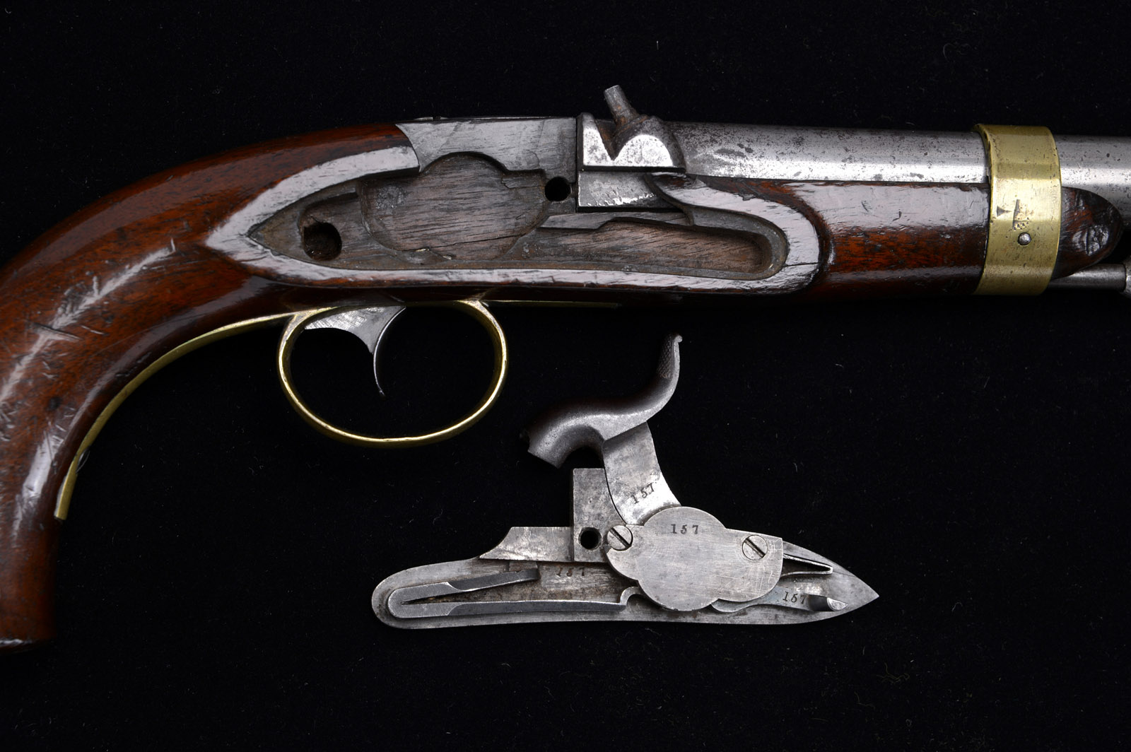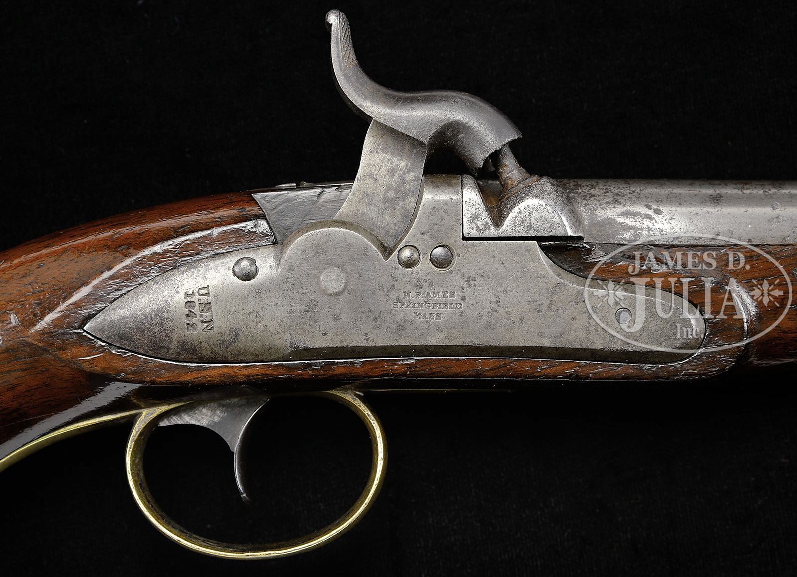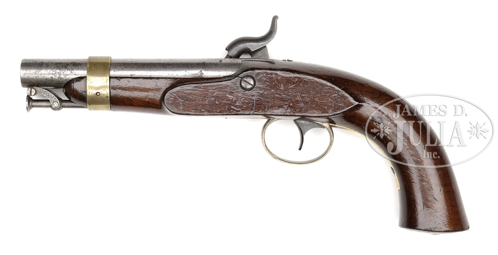 RARE EARLY AMES MODEL 1842 BOX LOCK PISTOL.SN NSN. This is a fine example of the first year production of the US Navy 1842 pistol. Flayderman notes production was only 300 guns. This gun conforms to other examples with a distinctive raised lock plate with beveled edge on front terminating in the rear to a point. The lock markings are those typically encountered being “N.P. AMES/SPRINGFIELD/MASS” and “USN/1842”. The 6″ 54 cal bbl is also dated “1842” and is marked “USN/JCB/P”. Furniture is brass and ramrod is captive swivel type. This is a nice example of a very scarce US martial. According to our consignor, this is one of the finest, if not the finest, of this rare example known. PROVENANCE: Collection of Charles A. Lamb. CONDITION: Very good overall. Metal overall is gray with bbl being cleaned with scattered areas of staining and pitting; markings are all discernible but worn on top of bbl from powder burn; bbl date and lock markings are very crisp and easily discerned as can be seen in photos; stock is sound and solid with scattered storage dings and dents; there is a hairline crack about 2″ long through escutcheon screw and stock retains 90% of its orig varnished finish. Mechanically gun functions well; bore is smooth but pitted. 4-50956 JS141 (10,000-15,000) – Lot 2534