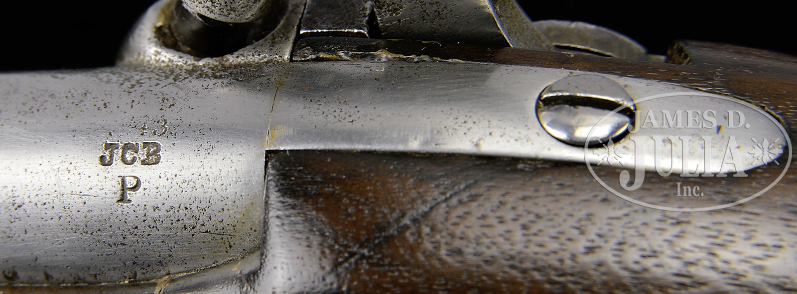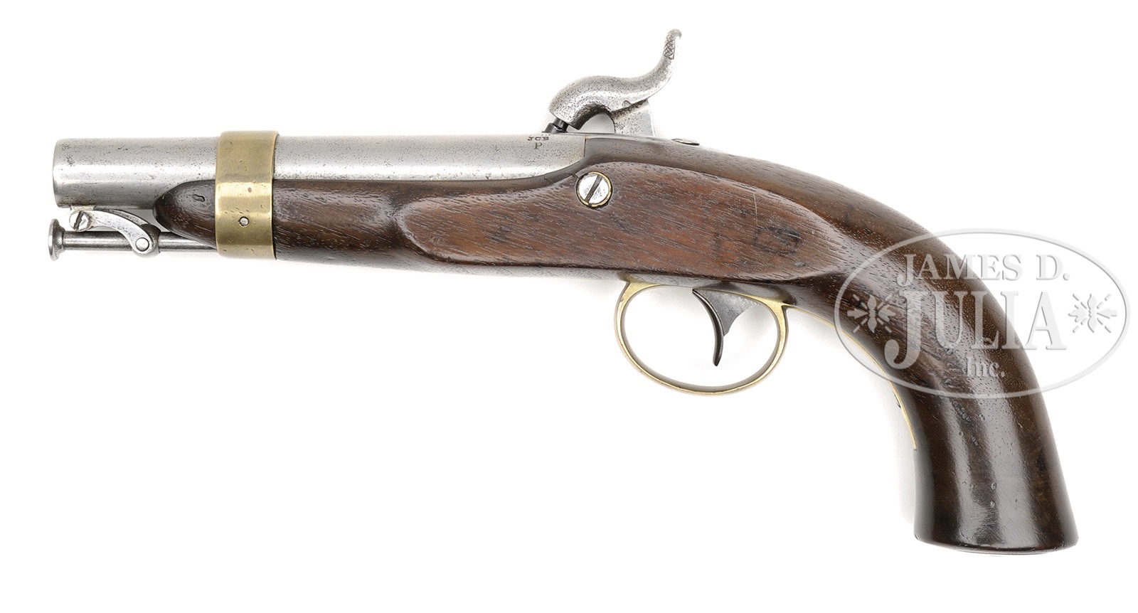 AMES MODEL 1842 BOX LOCK PERCUSSION NAVY PISTOL.SN NSN. This 1843 dated and inspected box lock US Navy single shot pistol was made by N. P. Ames. This gun conforms to other examples with 6″ 54 cal smooth bore bbl measuring just over 11-1/2″ overall. Lock is marked “NP AMES/SPRINGFIELD/MASS”. Lock and bbl are also both marked “USN 1843”. Inspector marks also occur on bbl and in two oval cartouches in stock though only discernible in outline. PROVENANCE: Collection of Charles A. Lamb. CONDITION: Good overall. Metal has been cleaned and is white/gray overall with pitting. Markings are discernible though “USN” and full bbl date are not visible; stock is sound and solid with scattered storage dings and dents and old sanding and refinish making inspector cartouches just barely visible in outline. Mechanically gun functions fine with pitted bore. Many parts have small inspector letters stamped. 4-50960 JS120 (3,500-5,500) – Lot 2535