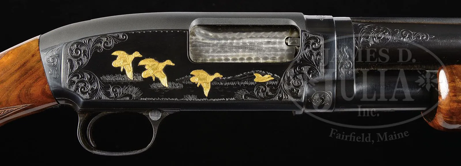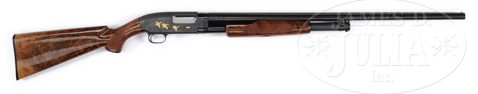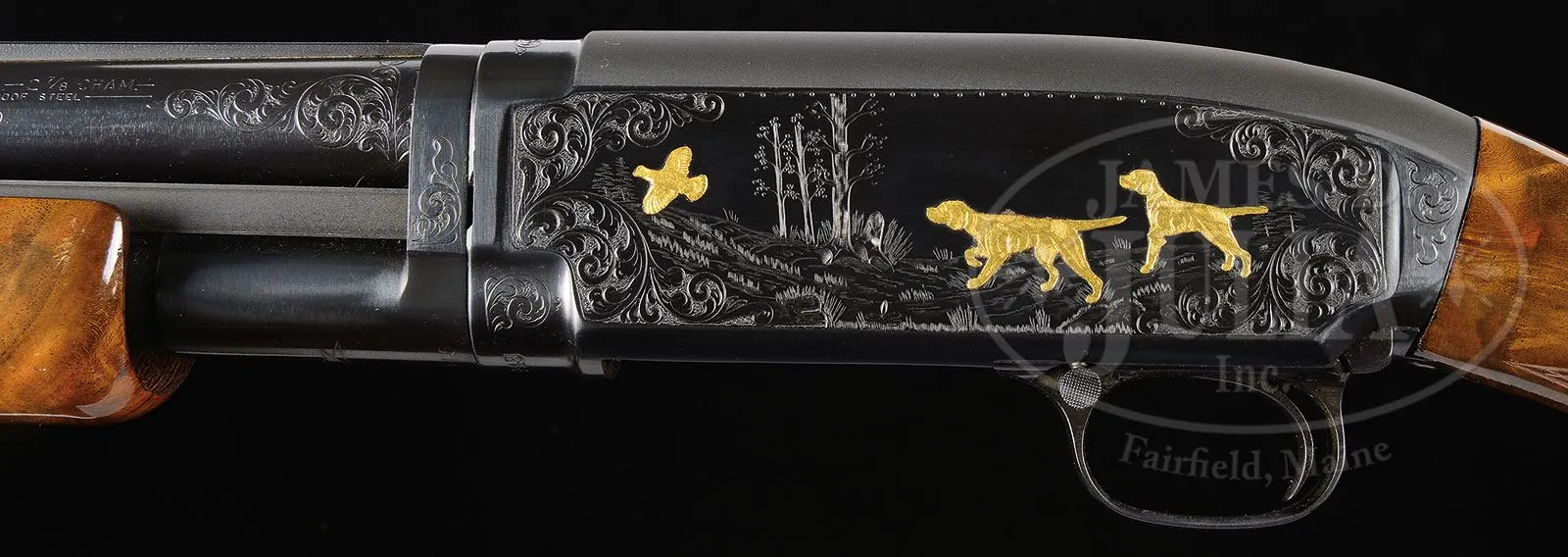SN 1120945. Cal. 28 ga. 2-7/8″ Chamber. 28″ Bbl, marked “modified” with raised, matted rib, is marked with Winchester information on left side, and with 1-1/2″ triangles of scroll engraving at breech end. Bottom of bbl assembly is engraved with a pigeon. Blued action with matted top is engraved in Model 12-5 style with large scroll surrounding vignettes of dogs and game, which have been gold inlaid in high relief; a pair of pointers, one pointing, the other honoring point, watch a grouse depart over a cleared meadow on left side of action, and a quattro of ducks flair over a marsh on right. Fine flame figured American walnut Winchester capped pistol grip buttstock measures 14-3/8″ over Winchester composition buttplate. Point pattern checkering is at grip, and on matching large forend. Drop at heel: 2-3/8″, drop at comb: 1-7/16″. Weight: 7 lbs 5 oz. LOP: 14-3/8″. PROVENANCE: Thomas W. Connally Estate Collection. CONDITION: Excellent, retaining essentially all of its custom finishes in wood and metal, with only a few light handling marks. Bore is excellent. A good looking upgrade ready for your next quail hunt. 4-55607 (3,000-5,000) – Lot 2536