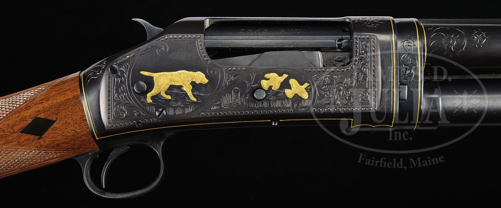 *FINE UPGRADE ENGRAVED WINCHESTER MODEL 1897 PUMP ACTION SHOTGUN WITH CUSTOM SOLID RIB 20 GAUGE BARREL.SN 982497. Cal. 20 ga. Beautiful custom Model 1897 with 28″ solid rib bbl and dbl beads. Mounted with very nicely figured, about 2X, flame grain American walnut with checkered small rnd forearm and straight stock, 14″ over a Winchester trademark hard rubber buttplate. Each side of the wrist is inlaid with a small black ebony diamond. Receiver is engraved with the large vignette of two bird dogs on point in a field scene in gold and a flying gold partridge in a small rnd vignette. Right side is engraved in Stokes style with a large vignette of a gold bird dog on point in a field scene with two flying gold partridges. Engraving is all surrounded by foliate arabesque patterns that has shaded background. Engraving extends over the top of the receiver, onto the bbl extension and chamber area of the bbl. There is a small matching pattern on the trigger bow. Receiver & bbl extension are outlined in gold wire with a narrow gold wire band around the bbl at the extension. Slide bar has gold inlaid curved lines at each end of the model number. Right side of bolt is engraved “TRAP GUN”. CONDITION: Very fine to extremely fine. Overall retains about all of its fine custom finish to both metal & wood with no discernible flaws. Mechanics are crisp, bright shiny bore. 4-54039 (4,000-7,000) – Lot 2537