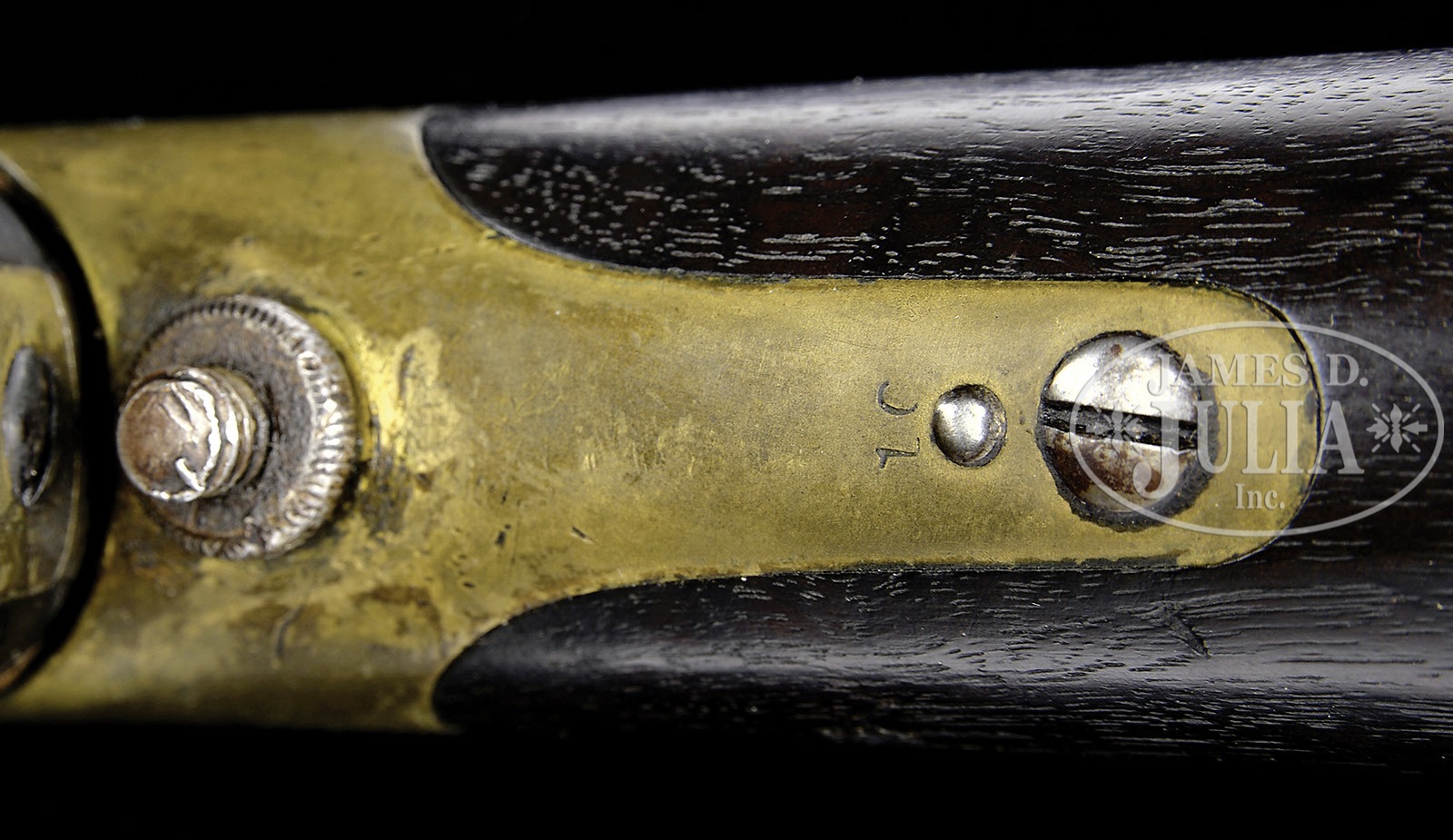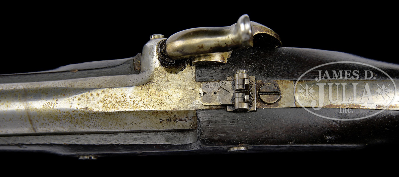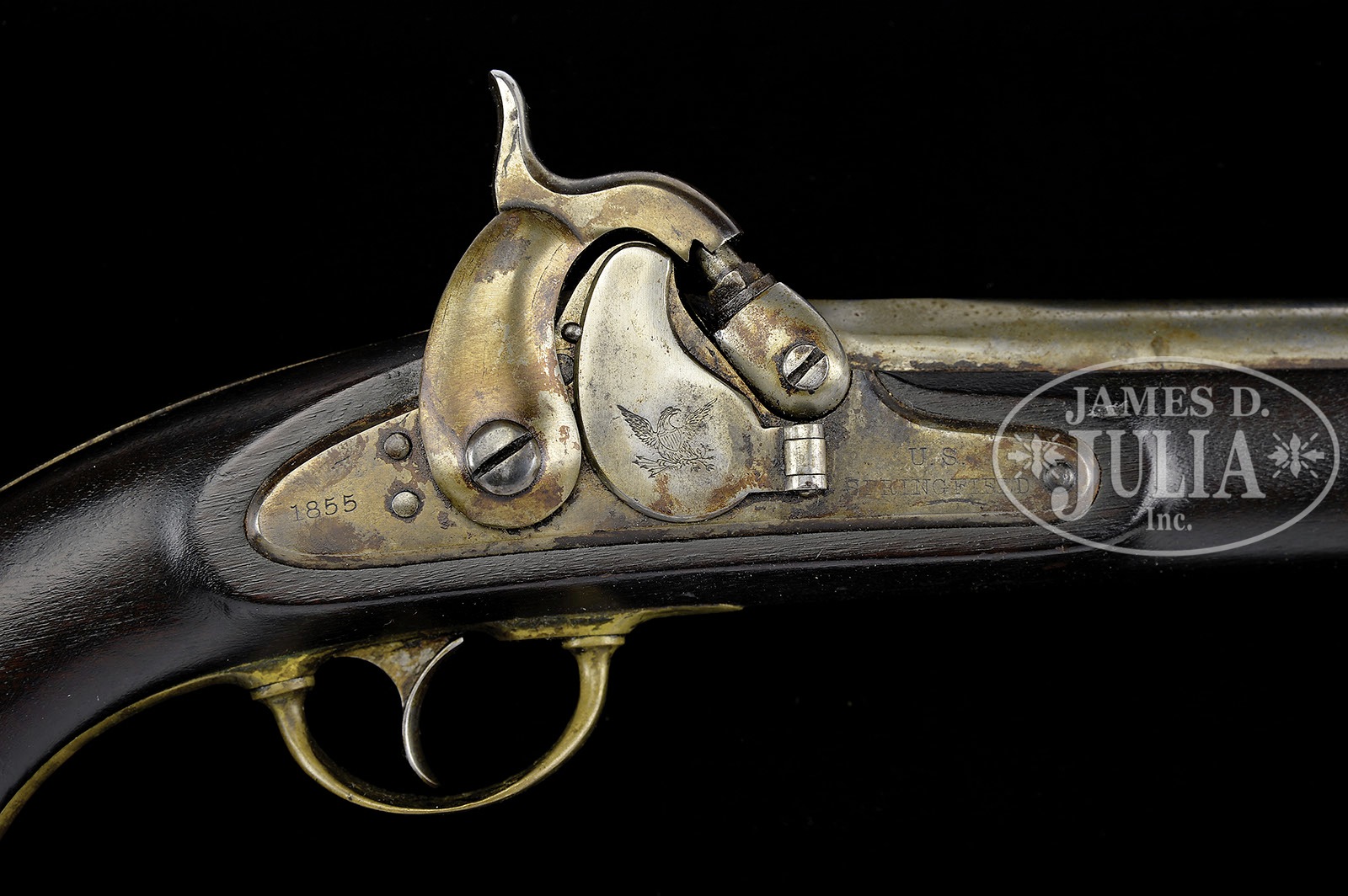 SPRINGFIELD MODEL 1855 PISTOL CARBINE WITH STOCK.SN NSN. Cal 58. Usual configuration with 12” oct to rnd bbl with small front sight and 2-leaf rear sight graduated to 400yds, usual markings on the lockplate with 1855 date. It has brass furniture with a captive rammer and sling loops on the band, butt of the pistol and toe of the stock. The pistol has assembly no. 10 on the butt and the stock has a matching assembly no. 10 on the lower tang. The heel of the brass buttplate is stamped US. PROVENANCE: Collection of Dr. Douglas Sirkin CONDITION: Very good to fine. Bbl retaining a considerable amount of what appears to be its original bright polish; with remnants of grease along bbl channel & around bbl band; proofs are clear; lock retains a considerable amount of its bright polish with considerable browning & staining; brass retains a dark mustard to brown patina; stock is very fine with a raised wood grain, a 3/4 x 1-1/4 piece of stock on left side adjacent to butt cap has been replaced with putty; finish on butt stock matches well. A good representative example of this important military pistol, unusual with matching numbers on pistol and stock. 4-49779, no MGM292 (4,000-7,000) – Lot 2538