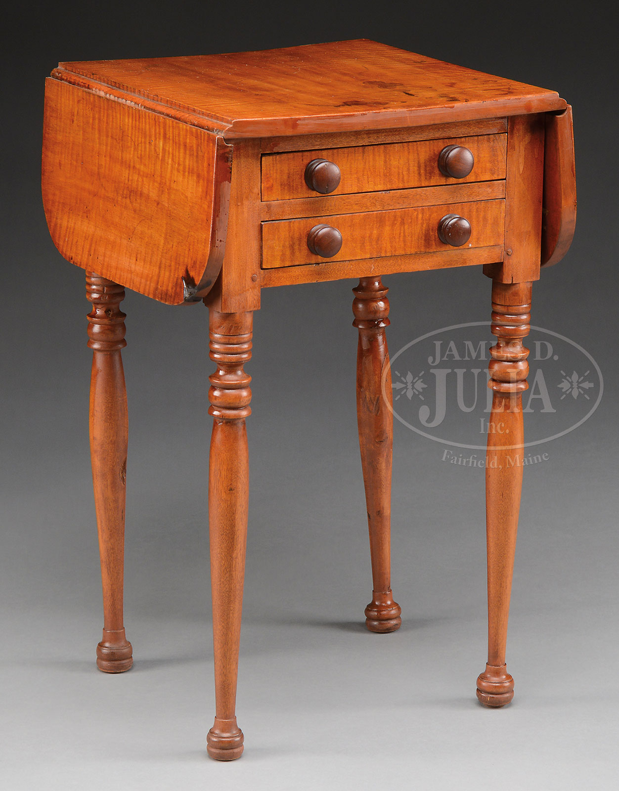 SHERATON TIGER MAPLE DROP LEAF WORKTABLE.2nd quarter 19th century, New England. The square top with D-form hinged leaves above the conforming case fitted with a bank of two drawers. Raised on ring and bobbin turned swelled cylindrical legs, raised on molded turned ball feet. SIZE: 26-1/2″ h x 16″ w 16-1/2″ d. CONDITION: Cleaned and re-polished, top with old darkened water stains, proper right leaf with old burn scar lower corner, otherwise good. 51911-6 (600-900) – Lot 2538