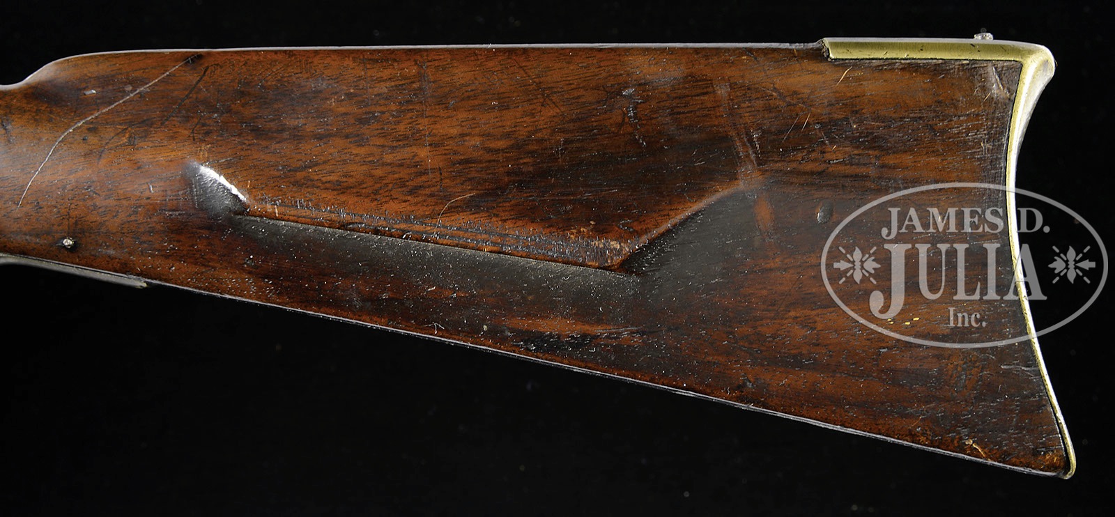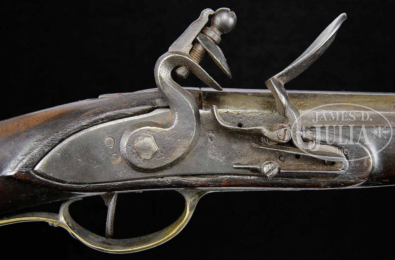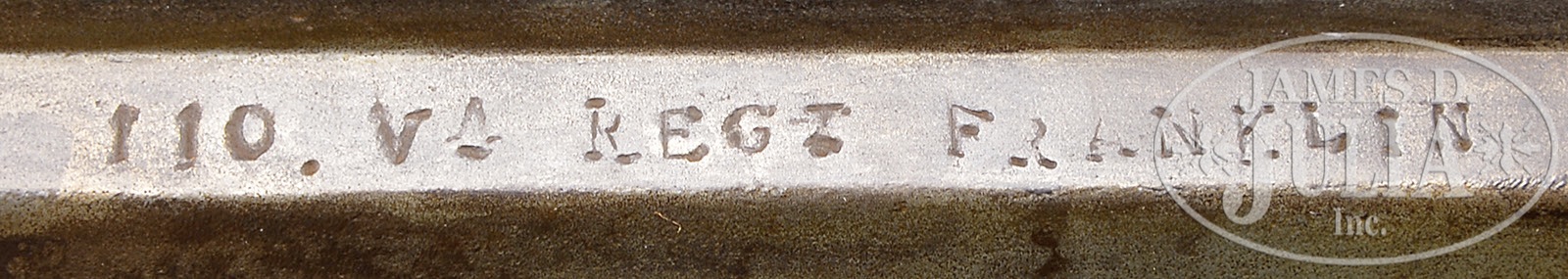 FLINTLOCK CONTRACT MUSKET STAMPED 110TH VIRGINAA REGIMENT FRANKLIN COUNTY, VA.SN NSN. Cal. 60. Overall length is 55″ with 39-7/8″ full oct smooth bbl, stamped “110.Va REGI FRANKLIN”. The bbl is fastened to the stock with 3 bbl wedges. This rifle has a walnut stock with a 2-pc brass patchbox, typical of those found on militia or contract rifles of the period and a 4-1/4″ iron 2-screw sideplate. Buttplate is 4″ high by 1-1/2″ wide. The flintlock appears to have been hand forged and to have been reconverted to flint. Franklin County, VA had two regiments during the Civil war of which the 110th was one. PROVENANCE: Collection of Dr. Douglas Sirkin. CONDITION: Very good. Wood is missing on each side of the bbl tang. Gun at one time was percussion and has later been converted to flint. 4-50099 RG107 (6,000-12,000) – Lot 2540