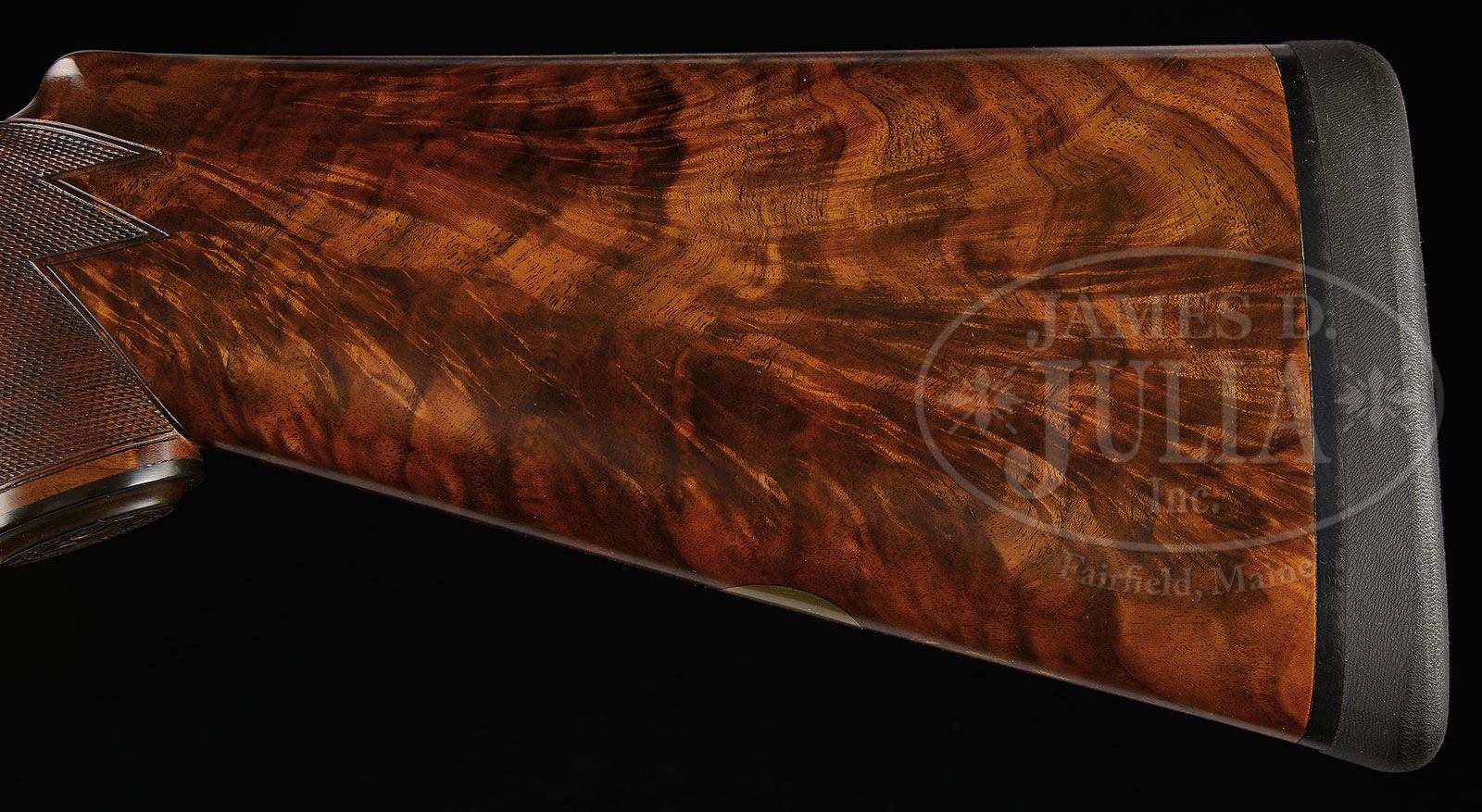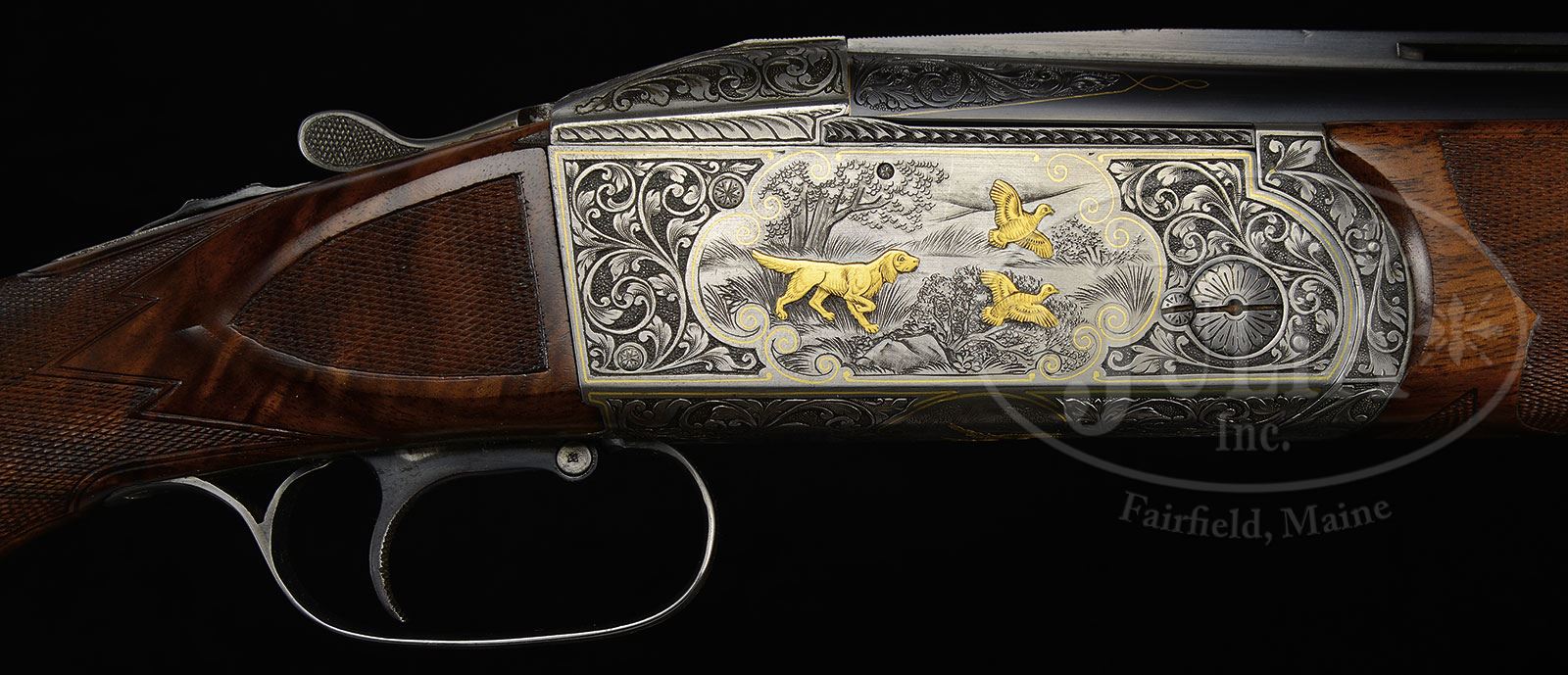 *REMINGTON MODEL 32, TWO BARREL SET ENGRAVED AND GOLD INLAID BY MASTER ENGRAVER, ANGELO BEE.SN 5159. Cal. 12 ga. 2-3/4″ Chambers. 28″ and 30″ Bbls, both have raised, ventilated ribs and Bradley beads. 28″ Bbls are gold inlaid “1” at rear portion of rib, and 30″ bbls inlaid “2”. Both sets have typical Remington nomenclature on left sides of top bbls, and with 1-1/2″ triangles of shaded scroll engraving outlined by gold wire borders at breech ends. Muzzles have gold inlaid scroll with scroll engraving on bottom bbl mounts. Both sets are numbered to the action. Coin finished Model 32 – F action features non-automatic safety and single selective trigger. Action is engraved with very fine, large, open, scrolled acanthus with well done shading and detail to leaves. This fine scroll surrounds vignettes of dogs and game with nicely engraved backgrounds to semi-relief, gold inlaid animals; a pointer points a quattro of flushing quail on left side of action, with a setter pointing a pair of flushing grouse on right. Bottom of action depicts a cock and hen pheasant taking flight. Each scene has gold inlaid wire scroll borders. Action is also outlined with gold wire inlay. This nicely composed and well rendered work is by noted Browning engraver, Angelo Bee, whose signature appears on trigger plate. Bottom of action is also factory marked with Remington, model, SN, and “SKEET”. Superb, flame figured American walnut Remington capped full pistol grip buttstock measures 13-3/4″ over black Decelerator pad. Well cut point pattern checkering with line border is at grip. Side panels are checkered, and a vacant gold oval is on toe line. Matching large forend has broad ribbons through extensive checkering pattern, and Remington’s modified Deeley type release. Bbl set no. “1”: Bore diameter: top -.729, bottom -.731. Bore restrictions: top -.006 (Skeet), bottom -.008 (Skeet). Minimum wall thickness: top -.042, bottom -.034. Drop at heel: 2-1/8″, drop at comb: 1-7/16″. Weight: 7 lbs 13 oz. LOP: 13-3/4″. Bbl set no. “2”: Bore diameter: top -.724, bottom -.723. Bore restrictions: top -.027 (Imod), bottom -.018 (Mod). Minimum wall thickness: top -.038, bottom -.033. Drop at heel: 2-1/8″, drop at comb: 1-7/16″. Weight: 7 lbs 13 oz. LOP: 13-3/4″. PROVENANCE: Thomas W. Connally Estate Collection. CONDITION: Excellent, retaining nearly all of its custom finishes on wood and metal, with a few light scratches and marks in wood. Coin finish of action darkening somewhat, mostly on left side. 30″ Bbls are slightly freckled. Mechanically excellent. 4-55650 (3,000-5,000) – Lot 2542