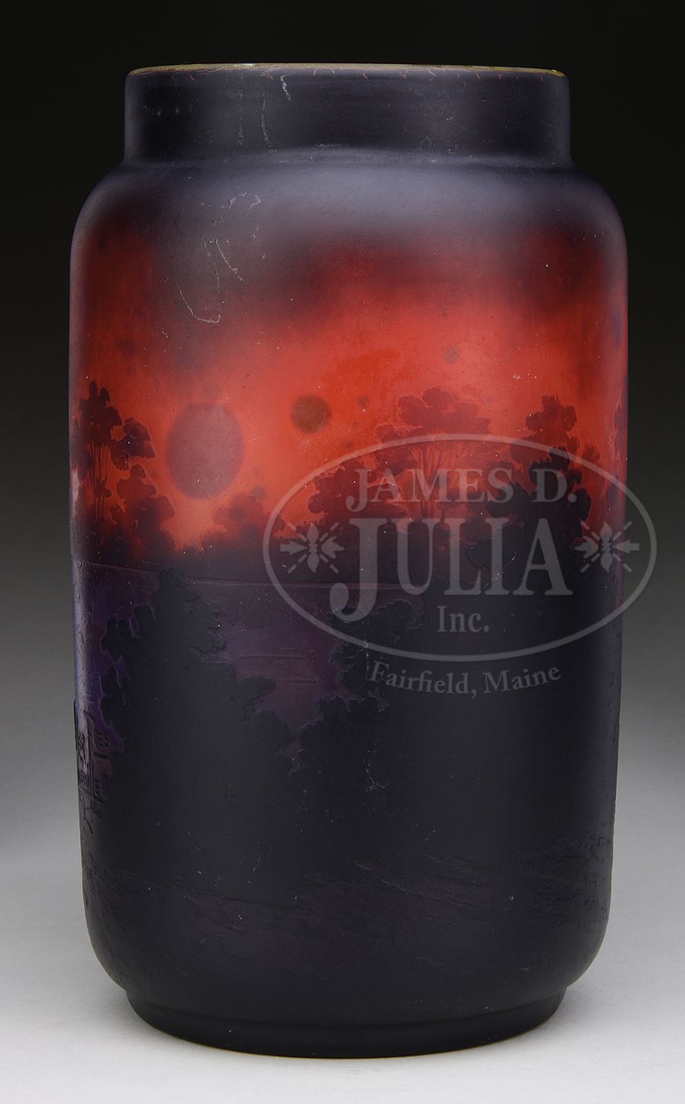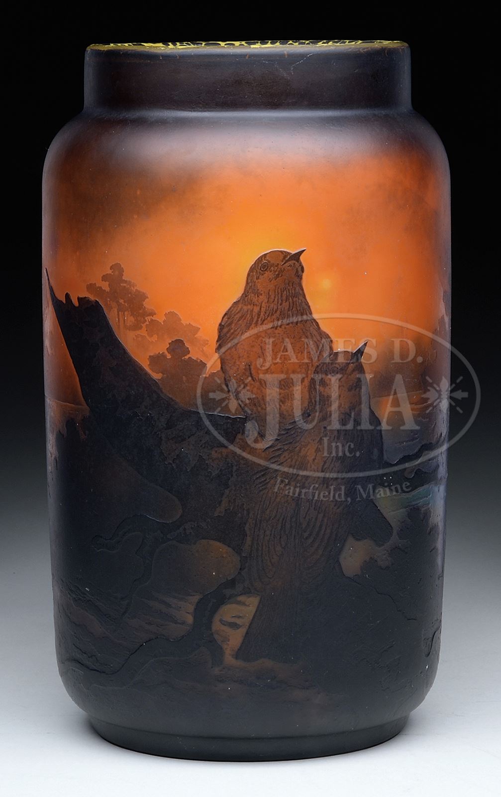 MULLER CAMEO GLASS VASE.Muller vase has dark brown cameo decoration of fallen tree at side of river with two nicely detailed birds resting on tree, dark cameo decoration is set against clear glass background with orange and yellow mottled glass cased on interior giving vase deep three dimensional feel. Cased yellow glass on interior is laced with bubbles giving wonderful textured appearance to sky. Dark cameo decoration in orange and yellow sky gives feel of evening sunset. Signed on side in cameo “Muller Fres Luneville”. SIZE: 9-1/4″ t. CONDITION: Very good to excellent. 50452-6 (12,000-18,000) – Lot 2542