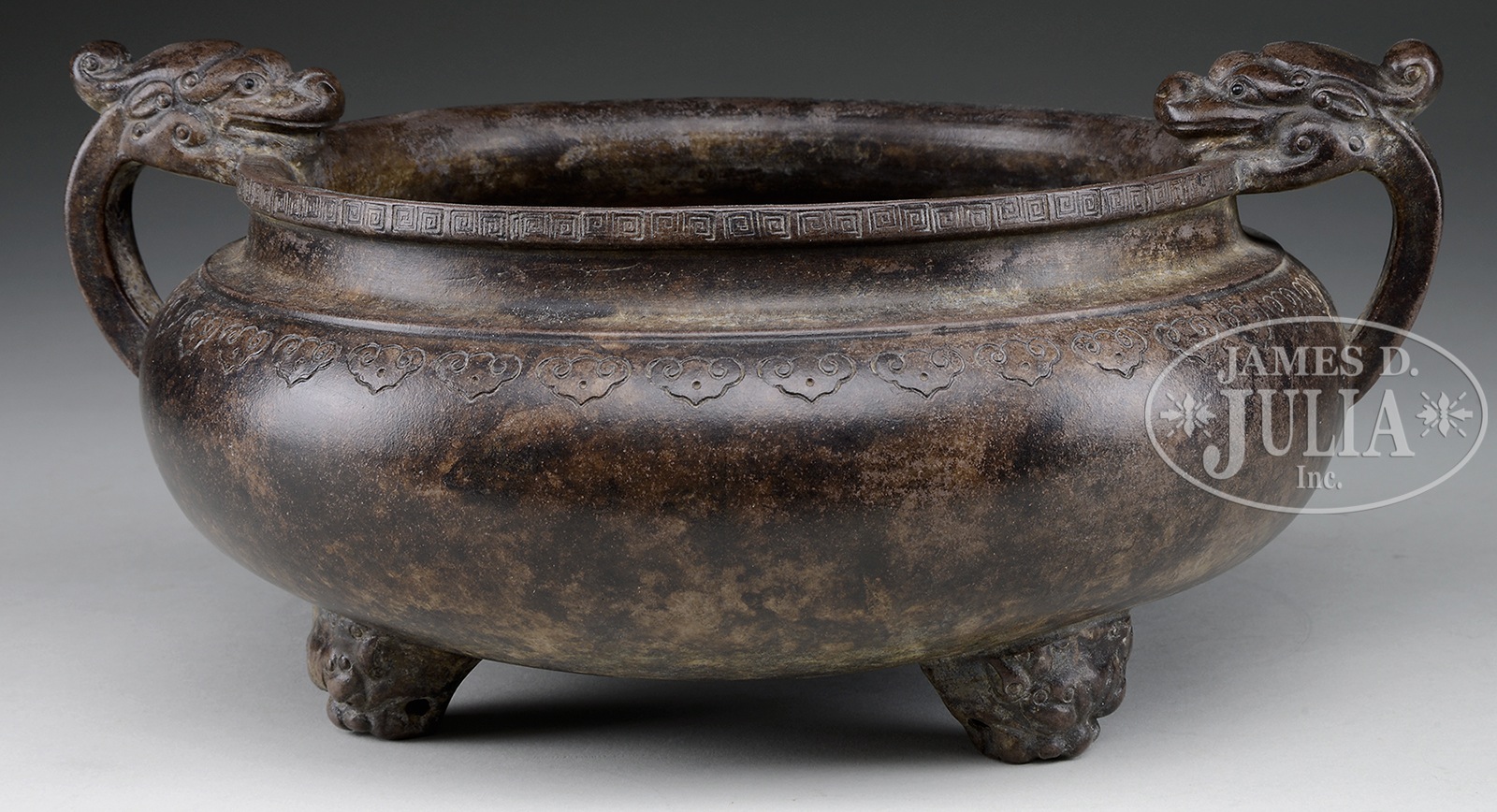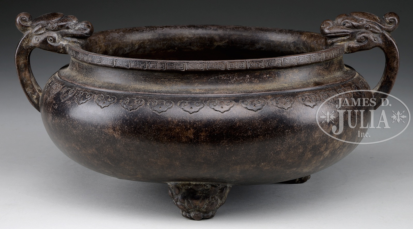 LARGE YIXING TRIPOD CENSER.China, 20th c. Of compressed bulbous form, the censer supported by three lion mask feet, the body with two dragon mask handles extending to rim, bottom with six character mark. SIZE: 11-1/2″ w x 5-1/2″ h CONDITION: Age related wear. 7-75246 (200-300) – Lot 2543