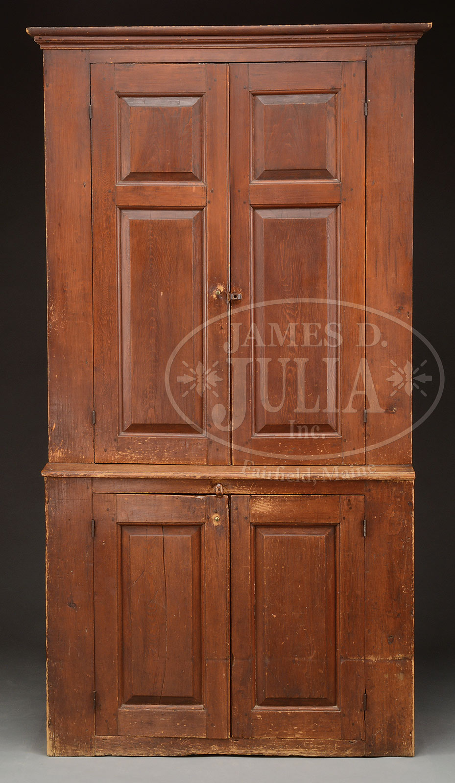 FINE EARLY AMERICAN PINE STEPBACK CUPBOARD.Second quarter 18th century, New England. The one part cupboard in original Spanish brown wash with stepped molded cornice above a pair of raised two panel doors opening to an interior of three fixed shelves, all above a narrow work surface with molded edge over a pair of single raised panel cupboard doors opening to an interior of two fixed shelves. Case sides of single wide pine plank. The back of two single planks with hand forged rosehead nails. SIZE: 87-1/2″ h. 44-1/2″ case width. 18-1/2″ d. CONDITION: Cupboard retains original surface and hardware. Interior in old red paint with minor and expected in use chip losses at base. Proper left side cornice and short section of left front cornice restored. Otherwise very good overall. 51859-1 (2,000-4,000) – Lot 2545