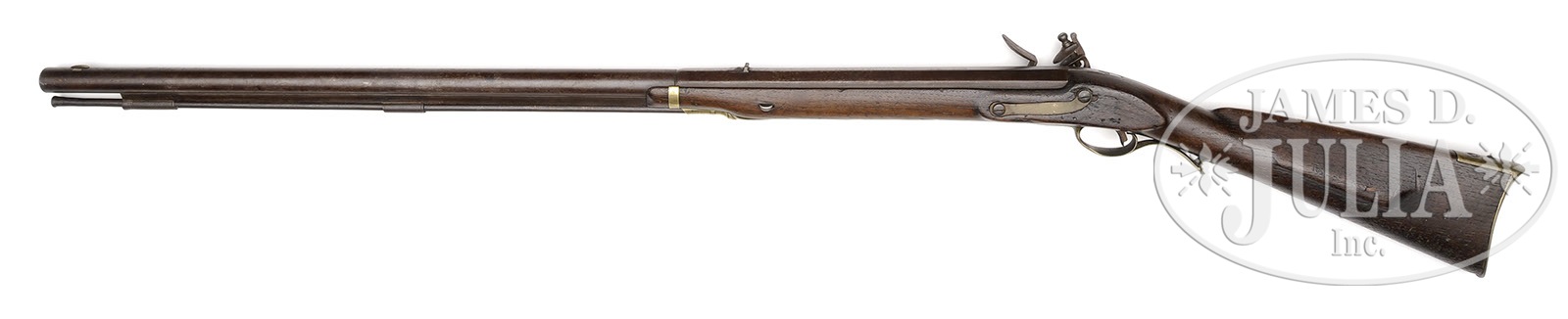 MODEL 1803 HARPERS FERRY RIFLE.SN NSN. .58 Cal. x 35-1/2″ long bbl lacking proof marks but has been reconverted to flint. Ramrod is old and appears to be orig. 5-1/4″ long lock marked under the pan with a spread wing eagle behind the cock “HARPERS/FERRY/1803″ which is a modern made lock fitted to this gun. Furniture consists of 2 iron forward rammer pipes, brass tail pipe, brass stock band, trigger guard, buttplate, patchbox and side plate all of proper Harpers Ferry pattern. Walnut stock measures 29-1/2” long, “A” stamped behind trigger guard and lacks inspectors markings opposite the lock. For anyone possessing an orig lock dated 1815-1819 this could be restored to a respectable piece. PROVENANCE: See Guide to American Antique Firearms and Their Values, 1998, by Flayderman, pp. 9A-112. Collection of Dr. Douglas Sirkin. CONDITION: Bbl has a dark even patina and has been artificially colored around touch hole, as has the entire lock. Balance of metal work is in very good condition. Walnut stock shows evidence of repair above the lock and additional wood repair around the lock to make it fit the mortice. No major loss and only minor nicks and scratches from years of handling. 4-49827 PAS29 (1,000-1,500) – Lot 2547