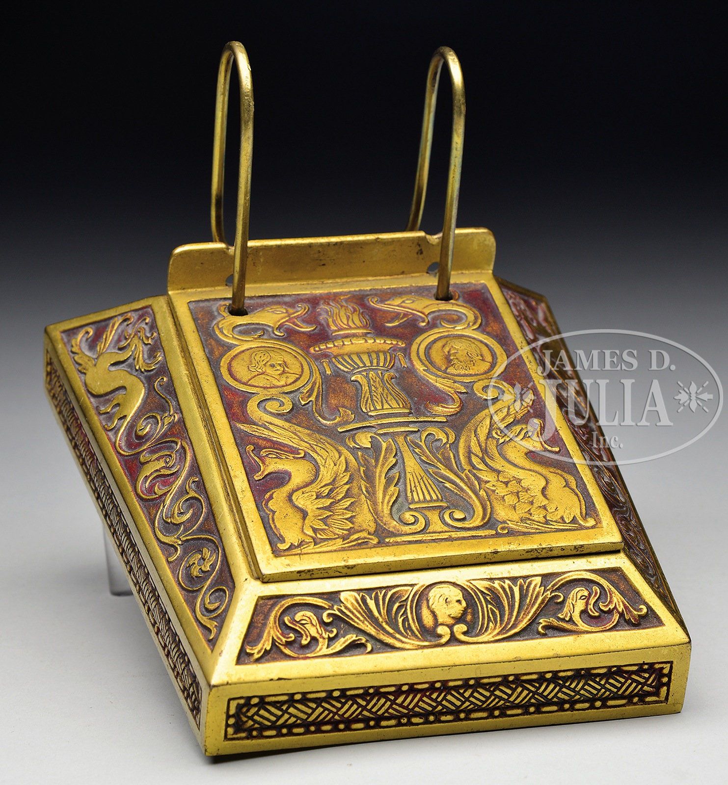 TIFFANY STUDIOS SPANISH DAILY CALENDAR.Tiffany Studios daily calendar frame in the Spanish pattern has gold patina with brown polychrome background. Stamped on the underside “Tiffany Studios New York 2002”. SIZE: 6″ d x 5-1/8″ at widest. CONDITION: Very good to excellent with some minor wear to patina. 5-69129 (1,000-2,000) – Lot 2547