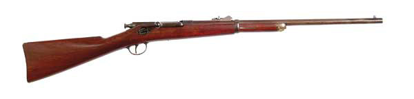 MARTIALLY MARKED WINCHESTER COMPOSITE HOTCHKISS CARBINE. Cal. 45-70. Standard carbine with 24″ round bbl, square base front sight with windage carbine rear sight mounted in a 2nd Model carbine stock with brass hinged foreend tip containing a 2-pc wiping rod. Chamber area is marked with standard US, Navy and Springfield markings and may be an altered Navy musket bbl. 1-pc stock has a sling ring on left side with carbine-style smooth steel buttplate. SN 1200. CONDITION: Bbl and receiver are mostly a plum-brown patina with blue in sheltered areas with pitting and artificial aging around the front sight. The two cut-off plate screws are missing. Stock is fine and retains most of its original finish. Bright shiny bore. 4-46674 JR134 (500-1,500)