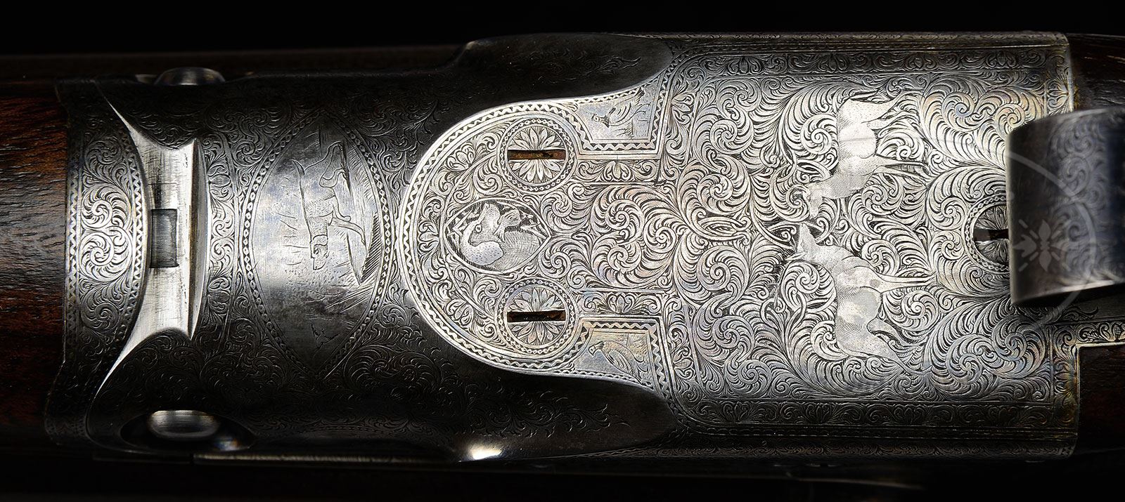 Please Note: Pre-ban ivory bead sight. Special Note: This item contains or is made of ivory. Do not bid on this lot unless you have read and agreed to our “Ivory Position Statement” and the “Waiver of Legal and Financial Risk to James D. Julia in regards to your Purchase of an Ivory Object“. This information is located in our catalog on pages 30 and 31. *UNUSUAL PARKER AH ORIGINAL TWO BARREL SET.SN 95986. (1900) Cal. 12 ga. 2 Frame. 2-3/4″ Chambers. This gun matches all specifications in the PARKER IDENTIFICATION & SERIALIZATION ledger including its extra set of bbls. Both of these Damascus bbl sets have their own forends (marked “1” and “2” on irons and loops), are 30″, and of fine Damascus, with concave ribs marked with Parker Bros Meriden, CT addresses, and “DAMASCUS STEEL”. All correct markings are on bbl flats and lumps. Case hardened action is filed with chevron on top lever and single bead around fences. Action is engraved in typical “A” style with 90% coverage medium scroll surrounding vignettes of pairs of dogs on each side; pointers on left, setters on right. “PARKER BROS” is on each side in front of dog scenes. There are additional scenes of game birds on front portions of action; pheasants on left, and grouse (?) on right. Bottom front of action portrays a pointer pointing flushing snipe. Trigger plate has retriever with bird in mouth at forward portion, and a pair of does facing each other at rear. A pair of setters is on trigger guard bow. SN is at grip. Dark marbled stump figured European walnut capped pistol grip buttstock measures 13-3/4″ over Parker dog’s head buttplate with spur. Hard rubber grip cap has inset large gold oval on top. Side panels are recessed and checkered, and have fleur-di-lis drop points. Checkering at grip is typical “A” style with fancy mullered borders and flourishes up toward comb. Matching splinter forends have nicely filed steel tips and typical releases. BBL set no “1”: Bore diameter: left -.730, right -.731. Bore restrictions: left -.011 (very lt mod), right -.002 (IC). Minimum wall thickness: left -.028, right -.030. Drop at heel: 2-5/8″, drop at comb: 1-5/8″. Weight: 7 lbs 4 oz. LOP: 13-3/4″. BBL set no. “2”: Bore diameter: left -.731, right -.731. Bore restrictions: left -.036 (full), right -.034 (full). Minimum wall thickness: left -.035, right -.037. Drop at heel: 2-5/8″, drop at comb: 1-5/8″. Weight: 7 lbs 11 oz. LOP: 13-3/4″. CONDITION: Very fine, as refinished. Bbl set no. “1” retains nearly all of a nicely colored re-brown with excellent definition to pattern. Bbl set no. “2” retains a considerable amount of an old re-brown, considerably worn from normal handling at breech ends, and thinned at muzzles. Action retains approx 30% of an old color re-hardening, engraving somewhat softened. Stocks retain most of an old oil finish with a few light marks and scratches, checkering nicely re-cut. Bores are excellent. Action is tight. 4-54784 (10,000-15,000) – Lot 2550