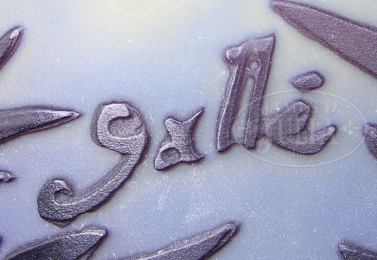 GALLE MOLD BLOWN CROCUS VASE.Galle vase has dark amethyst mold blown stems and leaves leading to light purple and blue mold blown crocus flowers with white outline. All against frosted pastel yellow background. Signed on side in cameo “Galle”. SIZE: 8-1/2″ t. CONDITION: Very good to excellent. 50501-133 (5,500-7,500) – Lot 2550