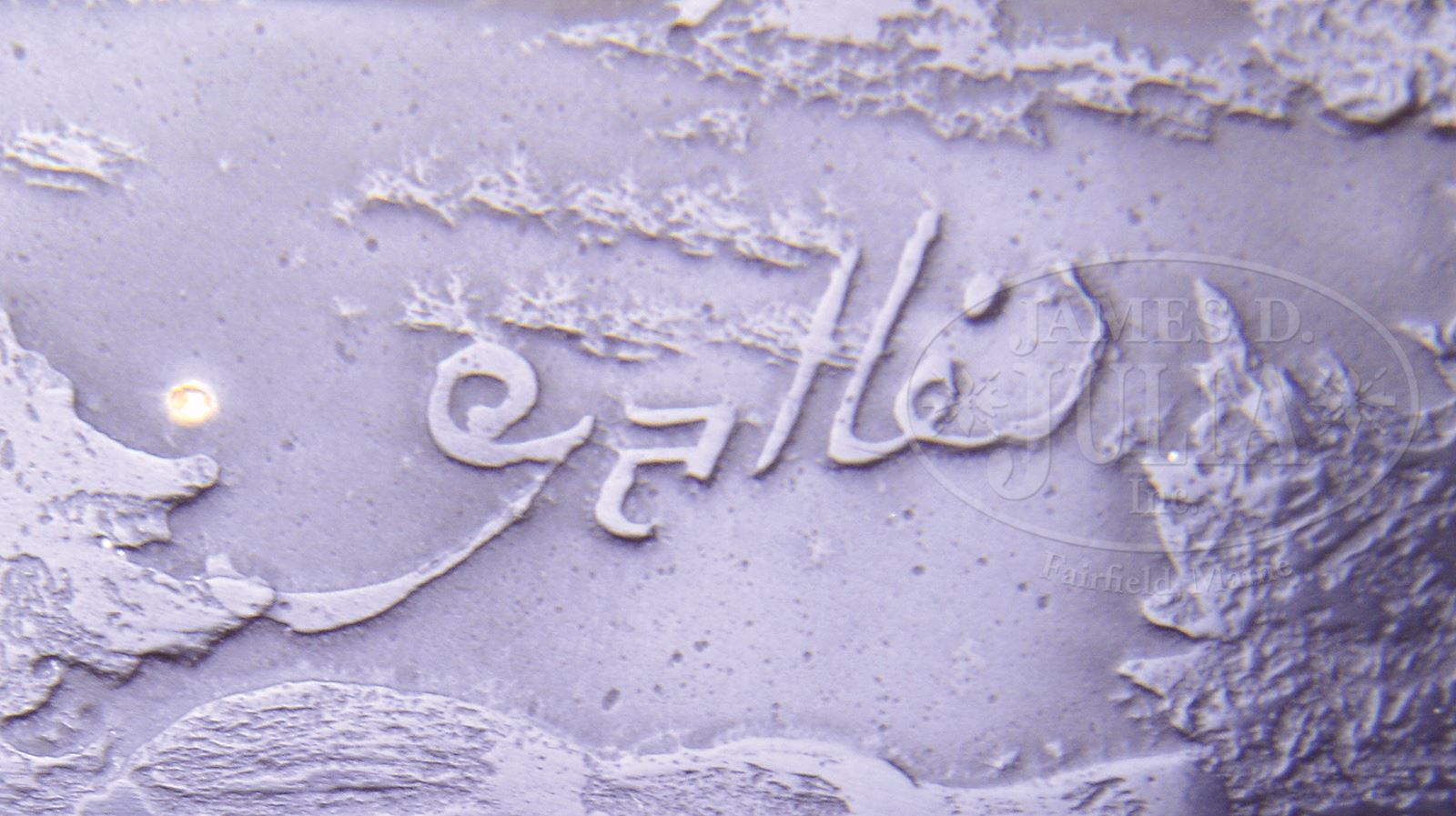 GALLE MOUNTAIN SCENE VASE.Galle vase has olive green cameo pine trees in foreground with hazy blue mountains in distance against cream shading to orange sky. Reverse has pine trees and mountains with small stream winding through valley below. Signed on side in cameo “Galle”. SIZE: 13-1/4″ t. CONDITION: Very good to excellent. 50501-56 (5,500-6,500) – Lot 2551