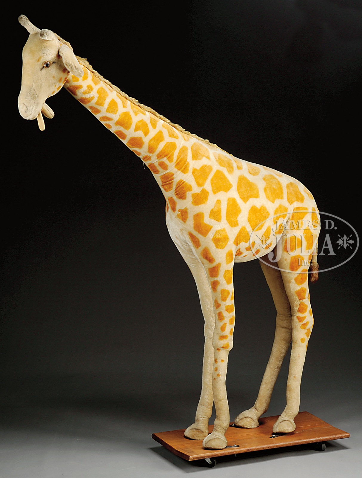 8′ STEIFF “STUDIO” GIRAFFE.These wonderful animals were purchased by stores like F.A.O. Schwarz for display purposes and were bolted to the floor by means of an L-shaped bracket protruding from their feet. This particular model, would have had a retail price of several thousands of dollars. In any toy store, this was literally the first thing a customer would see due to its size, appeal, and coloring. In very fine original condition. Certainly the pinnacle piece for a collector. SIZE: Approx. 8 ft. CONDITION: As stated above with some fading along the back. 1-13913 (1,200-1,500) – Lot 2551a