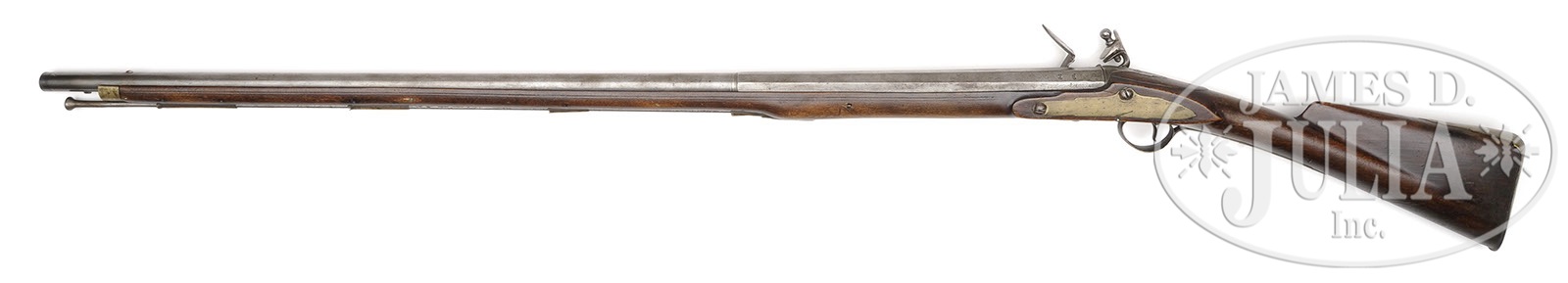 NEW ENGLAND FLINTLOCK OFFICERS FUSIL ATTRIBUTED TO ASA WATERS.SN NSN. 40-1/2″ oct to rnd smooth .70 Cal bbl with European bbl proofs at breech. Bbl has a bayonet stud at muzzle end. Engraved English flint lock is unmarked. Long brass sideplate is of the New England style and brass furniture is English. Stock is in relief in Brown Bess style around bbl tang. This fusil is attributed by the consigner to Asa Waters who worked in Sutton, MA 1776-1812. PROVENANCE: Collection of Dr. Douglas Sirkin. CONDITION: Good. Small sliver of wood missing on right hand side of forestock 9″ from muzzle. Wood cracked in front of lock. 4-49944 RG118 (3,000-5,000) – Lot 2552