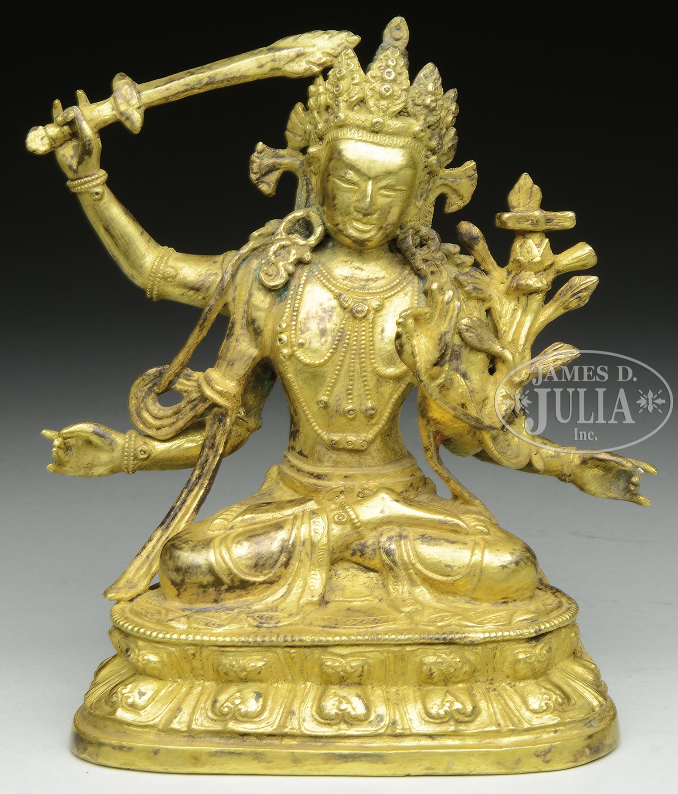 China, 20th c. The figure depicts Manjushri in gilt bronze, bottom with vajra symbol. SIZE: 6-3/8″ h CONDITION: Some loss of gilt, otherwise good 7-75285 (300-500) – Lot 2552