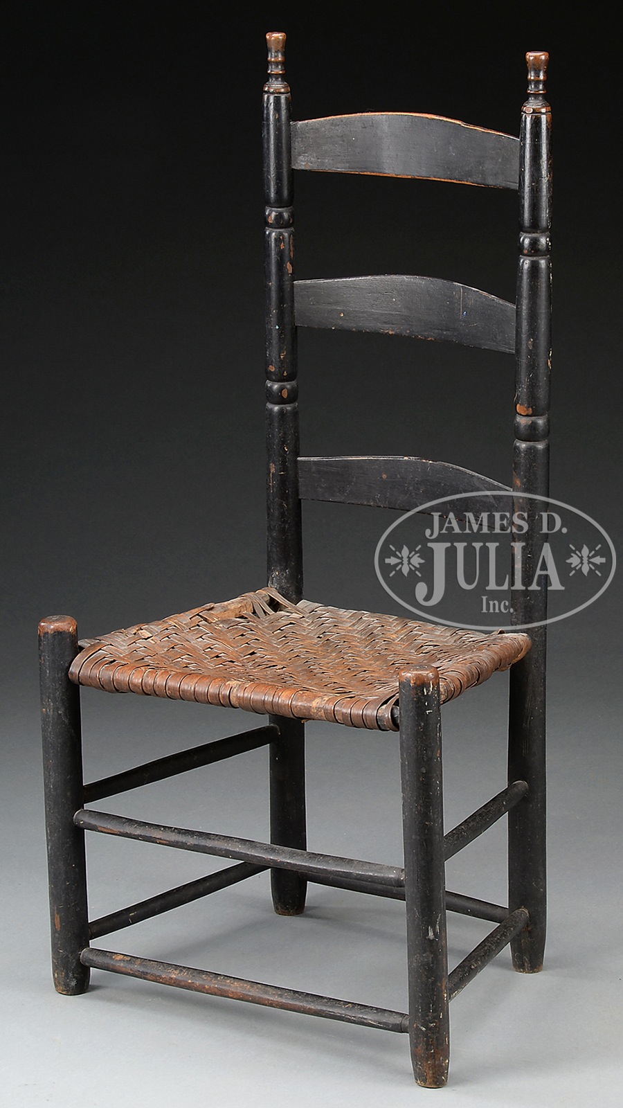 EARLY AMERICAN LADDERBACK CHAIR.New England, 2nd quarter 19th century. The small example in original dark green paint. The three arched splats joined to bobbin-turned stiles, headed by spool finials. The trapezoidal seat frame with woven splint seat raised on cylindrical legs joined by conforming double box stretcher. SIZE: 37-1/2″ h x 18″ w. 14″ seat h. PROVENANCE: Estate of Siro R. Toffolon, of Old Lyme, CT. CONDITION: Structurally very good, woven seat original with areas of loss due to weakness throughout. Surfaces with good patina. 49488-5 (75-125) – Lot 2553
