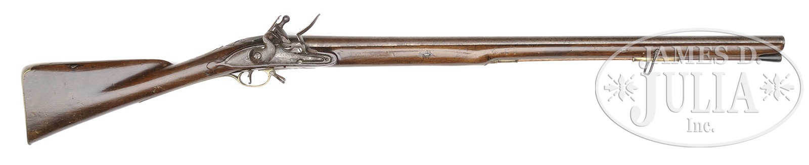 LATE 18TH CENTURY OFFICERS FUSIL.SN NSN. Cal. .665. 29-1/2″ Bbl is unmarked. Unmarked lock with bridled friction frizzen is mounted with round bodied serpentine cock. Walnut stock is nicely carved with moldings around lock and stand of arms brass sideplate, and has raised shell carving behind bbl tang. Stock extends to muzzle and fastens to bbl with two side nails without escutcheons. Furniture is of brass and consists of buttplate with stand of arms engraving, trigger guard with scroll on bow and fleur-di-lis finial, semi-relief shell terminated escutcheon plate, and beaded end brass ramrod pipe with matching tailpipe holding hickory ramrod with horn tip. PROVENANCE: Collection of Dr. Douglas Sirkin. CONDITION: Good. Bbl is light silver and brown over heavy pitting. Lock is cleaned, showing silver over brown patina and heavy pitting. Stock is good, cracked through wrist and repaired, with new varnish over all. Brass has dark mustard patina. 4-50102 MGM280 (5,000-8,000) – Lot 2555