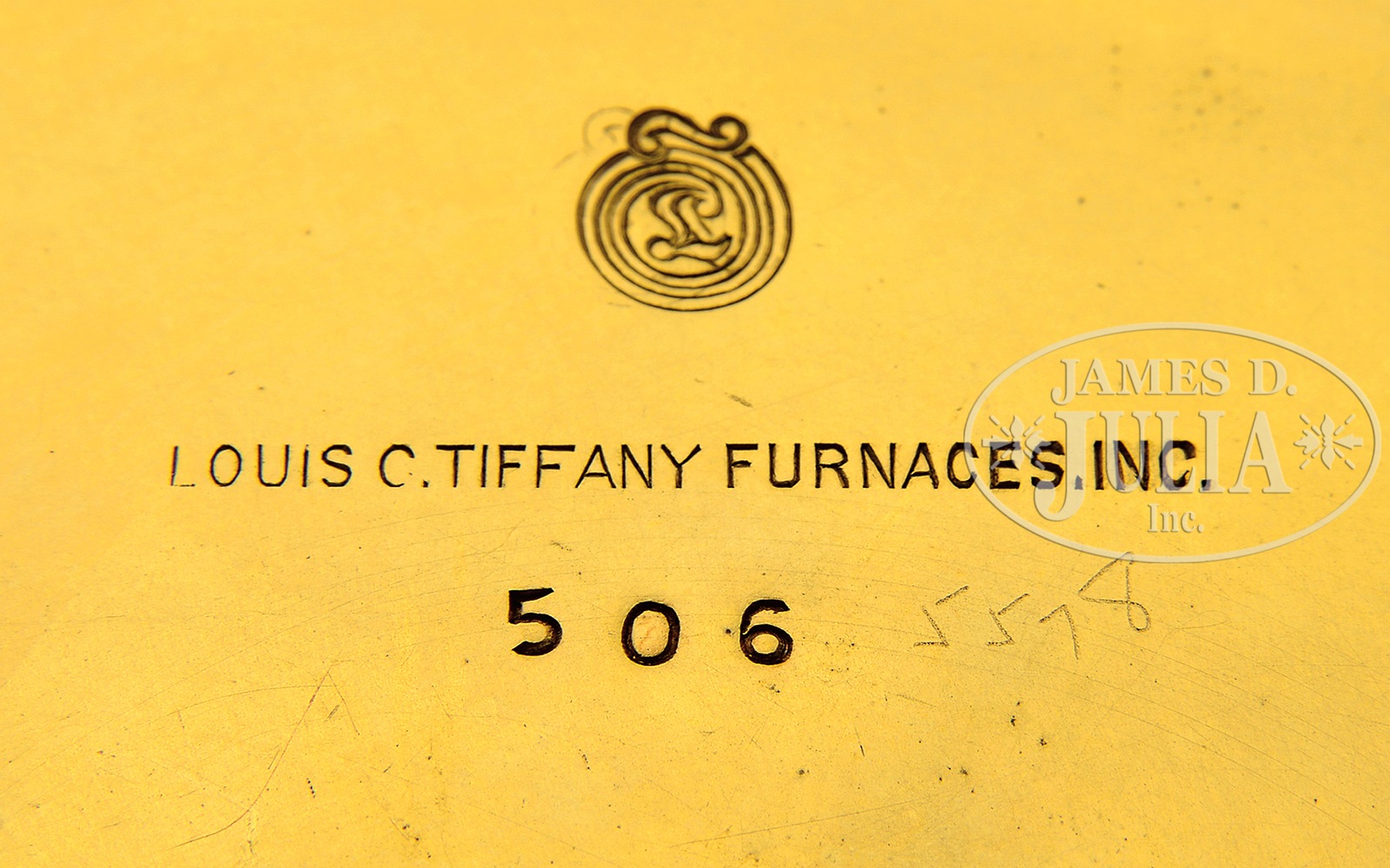 TIFFANY FURNACES DECORATED CENTER BOWL.Tiffany Furnaces center bowl has pedestal foot and is decorated around the rim with a stylized floral design with oval enameled centers. Centers are enameled in mottled green and pink. Bowl is finished with gold dore patina and is stamped on the underside “Louis C. Tiffany Furnaces Inc. 506″ along with the Tiffany logo. SIZE: 10-1/8” dia. CONDITION: Very good to excellent. 5-69146 (500-800) – Lot 2556