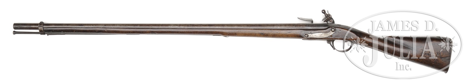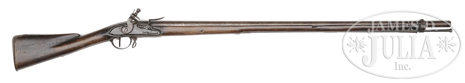 SN NSN. This gun started out life as a French imported Model 1774 infantry musket which was branded “UNITED STATES” on bottom of buttplate and on left side of buttstock. This brand was authorized by Congress February 14, 1777 and this mark is highly counterfeited however these marks are impeccable and orig. This gun, after the Revolutionary War, was converted to a Fowler by shortening the bbl to 38-1/2″ removing bbl bands except utilizing a cut section of front strapping band that retains the front blade sight. Three ramrod thimbles were added to channel, they are pinned as pins were added to secure bbl. Lock, escutcheon, bbl, trigger guard and buttplate are all orig to the configuration and bear various French proofs though some are only lightly discernible from long, hard use. United States brands however, are prominent and are quite rare in this configuration. PROVENANCE: Collection of Dr. Douglas Sirkin. CONDITION: Metal overall is brown/gray with pitting especially inside pan and breech; hammer is of correct configuration but has different patina and is possible replacement as is frizzen. Gun was not disassembled but reconversion is most likely due to added hammer and frizzen. Wood as configured is fairly sound and solid though there is a glued repair of forearm between the rear ramrod thimbles; bbl band spring slot is inset with piece of wood most likely at time of conversion to current configuration after the war; there is a large 3″ x 1″ piece of wood repair above lock between breech and tail; remainder of wood has a hand worn patina and the two United States brands are untouched and orig; the left side of stock has the initials of once proud owner nicely cut “S*F*P”. 4-50076 JS213 (4,000-6,000) – Lot 2559