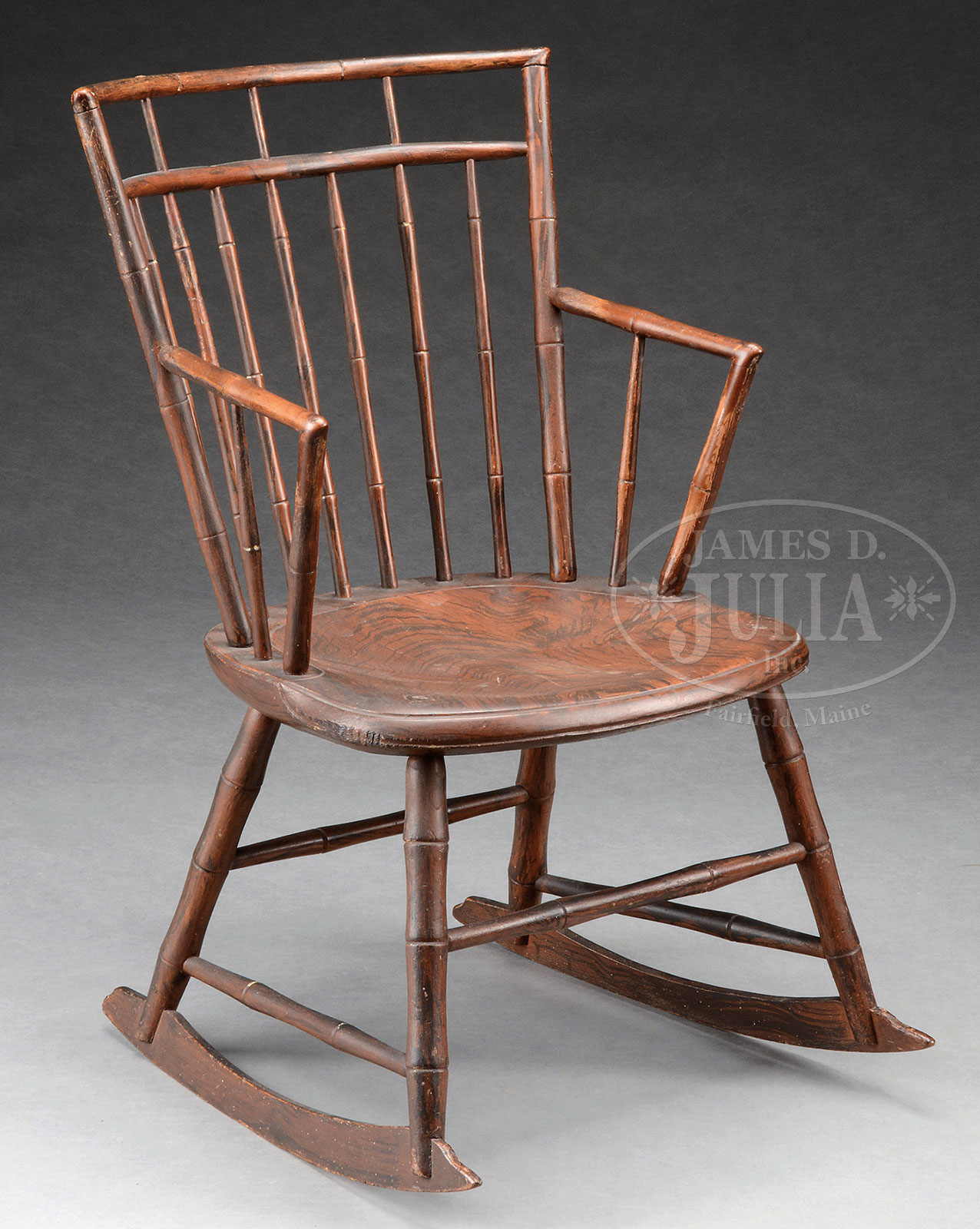 FINE BIRDCAGE WINDSOR GRAIN PAINTED ROCKING CHAIR WITH ARMS.Early 19th century, Danvers, Massachusetts. The birdcage back of typical form of simulated bamboo spindles joined to horizontal arms on conforming supports centering the shaped saddle feet, raised on splayed cylindrical legs joined by box stretcher. The whole on shaped runners with simulated rosewood graining throughout. *NOTE* An old paper label faded and nearly illegible is taped to the underside of the seat which reads “This chair belonged to Jethrow and Hannah Giddings of Putnam / Rebecca Nurse House / Danvers, Mass”. Rebecca Nurse House, a 17th century home located in Danvers at 149 Pine Street. The house was originally lease by a Reverend Allen to Francis and Rebecca Nurse. Rebecca was accused of witchcraft, condemned, and hanged. Among her accusers were John, Edward, and Ann Putnam, Jr. In 1784 Benjamin Nurse sells the home property to Phineas Putnam of the same Putnam family that accused Rebecca Nurse 92 years prior. Jetherow and Hannah Giddings, Hannah born Hannah Putnam. This appears to be the same Putnam family that has its roots in the Nurse family of Salem 17th century. SIZE: 31″ h, 15″ h (seat) x 19-1/2″ w. CONDITION: Structurally sound, original grain decoration with normal and expected in-use wear. Original grain decoration very much intact. Front legs have been re-attached through seat with either dowels or screws and then filled and colored. Very good. 52236-17 (500-700) – Lot 2560