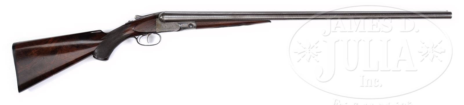 PARKER GH WITH CASE, ACCESSORIES AND HANG TAGS.SN 83003. Cal. 12 ga. 2-5/8″ Chambers. 1-1/2 Frame. 30″ Beautifully patterned Damascus bbls are marked with Parker Meriden address and “DAMASCUS STEEL” on concave, matted rib. All correct marks and numbers are on bbl flats, lump, and water table of case hardened action. Action features automatic safety and double triggers, is engraved in typical “G” style, with vignettes of game birds in ovals under “PARKER BROS” on sides, with more game birds in circle on trigger plate, along with some sprays of scroll and geometric borders. Nicely flame figured American walnut capped pistol grip buttstock measures 14-3/16″ over Parker dogs head buttplate with spur. Standard point pattern checkering is at grip. German silver shield on toe line is engraved “A. K. DETWILLER EASTON, PA”. Matching splinter forend has typical release and steel tip. Gun matches all specifications in Parker Identification and Serialization ledger. Bore diameter: left -.730, right -.729. Bore restrictions: left -.036 (full), right -.037 (full). Minimum wall thickness: left -.036, right -.033. Drop at heel: 3-3/16″, drop at comb: 1-7/8″. Weight: 7 lbs 9 oz. LOP: 14-3/16″. Interesting old leather case, patented Oct ’71, has raised, embossed, brass oval on lid, and tacked on brass corners. Interior is lined in green cloth, and has accessory compartment in lid with hinged cover. A label is affixed on underside marked “Dr. A. K. Detwiller”. Compartment contains 3-pc BGI cleaning rod with assorted brushes, some primers and percussion caps, a lead remover, two rifle cleaning rods, assorted old papers, tubes of cleaning grease, and “Marlin Rust Repeller”, along with Dr. Detwiller’s business card and military dog tag for the 53rd Artillery Company. His rank was major, and he was a member of the Medical Corps. Bottom compartment contains more cleaning equipment including Winchester Rust Remover and a bottle of Hoppes no. 9, with a cork stopper. Also included are the hang tags for this particular gun. PROVENANCE: Thomas W. Connally Estate Collection. CONDITION: Very fine. Bbls retain over 90% of their vivid orig Damascus finish, which is quite striking. Action retains 50 – 60% orig case hardening color, with considerable oxidation and staining on left side and on bottom. Trigger guard is also stained, but retains a considerable amount of its orig blue. Buttstock retains most of what appears to be its orig finish, but has been polished and augmented with rubbed oil over the years, over a number of scratches and marks, checkering slightly worn. Bores are very fine with light frosting. Action is tight. Case leather is cracked and deteriorated, with numerous losses and scuffs. Handle is detached on one end. Strap retainers are ripped. Interior cloth is fair, with insect damage and soiling. Accessories are good. Hang tags are considerably foxed, with some creasing. A unique time capsule. 4-55683 (3,000-5,000) – Lot 2561