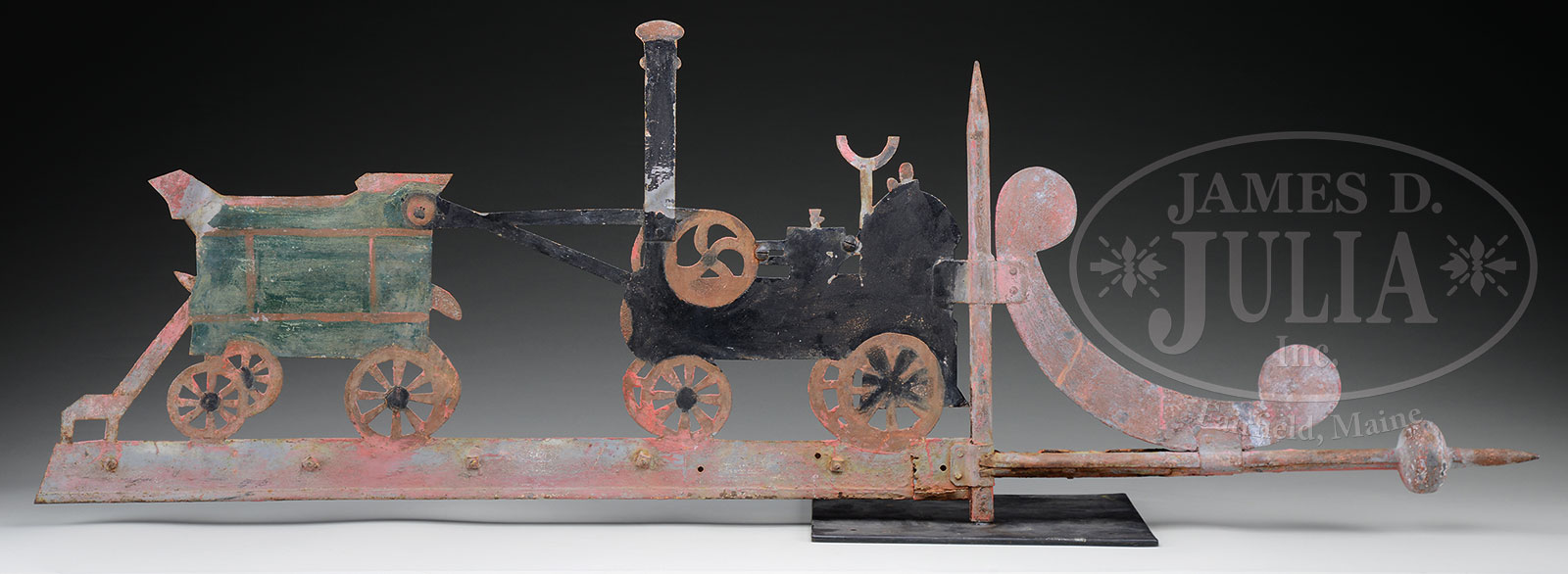 UNUSUAL FOLK ART STEAM TRACTOR AND WAGON WEATHERVANE.First quarter 20th century, American. This sheet steel example of a steam powered farm tractor and wagon each on spoked wheels. Joined to a central pointed tube. The opposing end with C-scroll sheet steel element mounted on a rod with pointed tip and compressed ball finial. Now on a museum stand. SIZE: 18″ overall h x 53″ l. CONDITION: With significant corrosion and rust. Weather vane reinforced by welded addition of angle iron along the original tube. Weather vane retains polychrome painted surface. Structural integrity good. 52308-32 (700-900) – Lot 2564