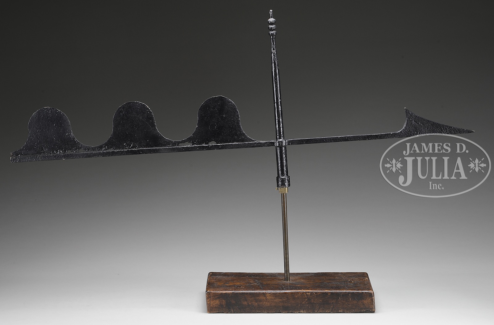 WROUGHT AND SHEET-IRON HARPOON WEATHERVANE.Late 19th, early 20th century, New England. This nice folk art example of a New England weathervane fashioned in the shape of a harpoon point. Sheet iron tail section fashioned as “waves”. The whole with a central spire. Mounted on a painted wood base. Mounted on a museum stand. SIZE: Vane: 16-3/4” h x 44” l. CONDITION: Generally good with some deterioration to sheet iron. 9-93778 (300-500) – Lot 2565