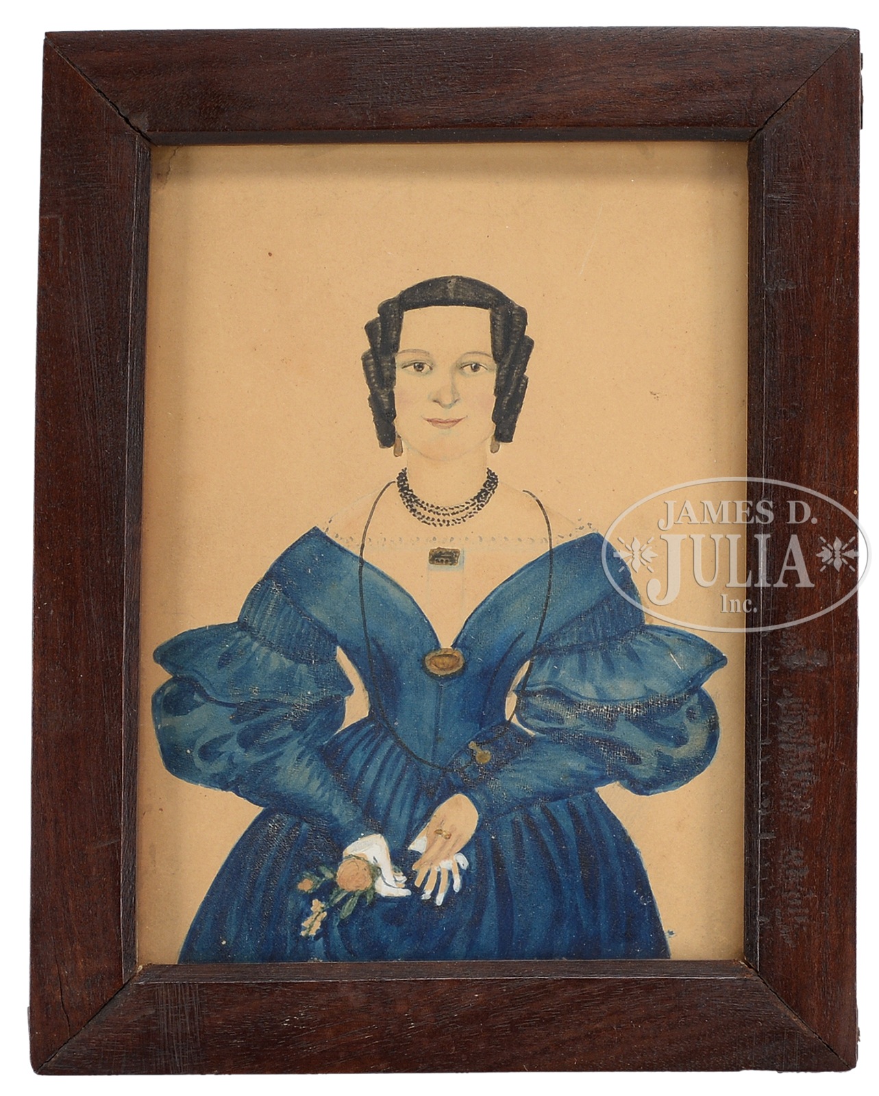 NICE WATERCOLOR PORTRAIT OF “MRS. MATTINGLY OF 9 GEORGE STREET.”.Second quarter 19th century, possibly Maine. The woman gazing forward in an indigo blue gown with puffy sleeves holding a small bouquet of flowers in her gloved right hand. SIZE: 5-1/2″ x 4-3/8″ sight. CONDITION: Paper laid down on cardboard, overall light and even toning. Some light craquelure in folds of dress and sleeves, otherwise good. 50558-17 (400-600) – Lot 2566
