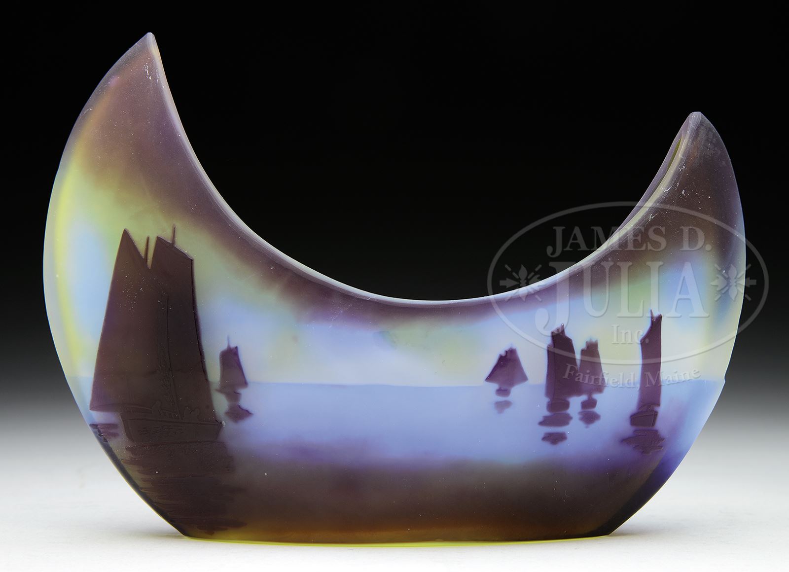 GALLE NAUTICAL CAMEO VASE.Galle crescent shaped vase is decorated with dark purple boats at full sail on blue ocean waters shading to purple in foreground all against mottled yellow and blue sky. Signed on side in cameo “Galle”. SIZE: 7″ w x 5-1/2″ t. CONDITION: Very good to excellent. 50501-16 (3,000-4,000) – Lot 2567