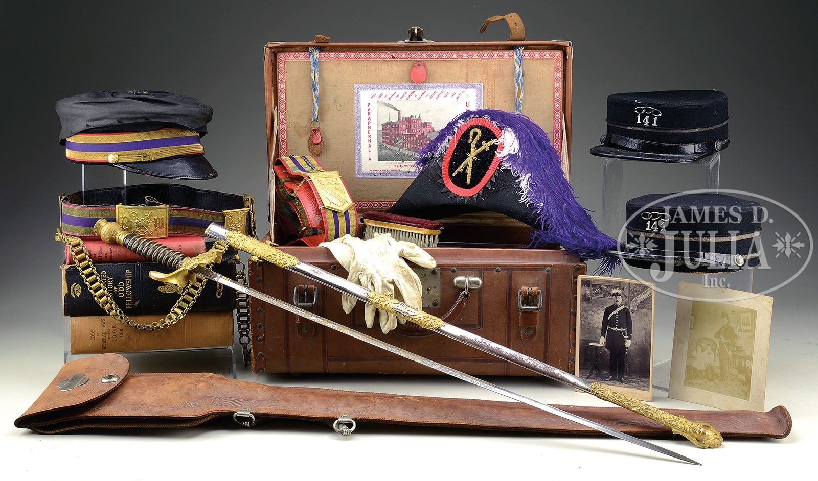ARCHIVE OF A PRESQUE ISLE, MAINE ODD FELLOW.Included in this archive is presentation Odd Fellow sword made by MC Lilley, Columbus, OH with the name “CLARENCE E. GOODING PRESQUE ISLE, ME”. Sword is in beautiful conditioning retaining much of its original gilt and luster to blade, finely preserved in original chamois bag and tooled leather storage case, which also has his name applied in shadowed lettering. Four different pieces of head gear in near pristine condition are retained in leather casing, especially compartmentalized for each hat with protective covers or rain covers for each of the three kepi style hats and chapeau de bras. There are two vintage photographs of Gooding wearing the same sword, sword belt, over the shoulder belt, and chapeau de bras. There is a 3-page manuscript listing the 1882 founding of the Presque Isle Lodge with a list of members. There are also three Odd Fellow books including Poems for Odd Fellows and Rebeckahs, 1900 and Codes of General Laws of the I.O.O.F., 1915 and The Illustrated History of Odd Fellowship FLT, 1915. CONDITION: Overall, sword and hats are fine to excellent due to storage in leather trunk and leather casing. The purple plume on the chapeau is deteriorating, but hat itself is quite fine. Cabinet card is very good The gelatin photograph showing children is faded with soiling. Manuscript is frayed with cracks at fold. Books are good and sound with the Illustrated History having hinges that are starting and chipped spine at edges. Leather sheath for sword has broken stitches. 49937-2 (300-500) – Lot 2569