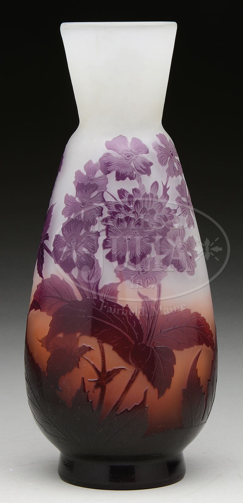 GALLE CAMEO GLASS VASE.Galle vase has deep amethyst cameo leaves and stems leading to clusters of light amethyst flowers. All set against shaded peach to cream background. Flowers and leaves are nicely detailed and vase is signed on side in cameo “Galle”. SIZE: 10-1/4″ t. CONDITION: Very good to excellent. 50501-7 (1,800-2,400) – Lot 2574