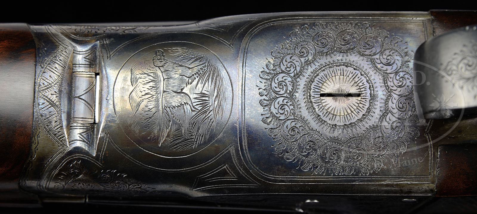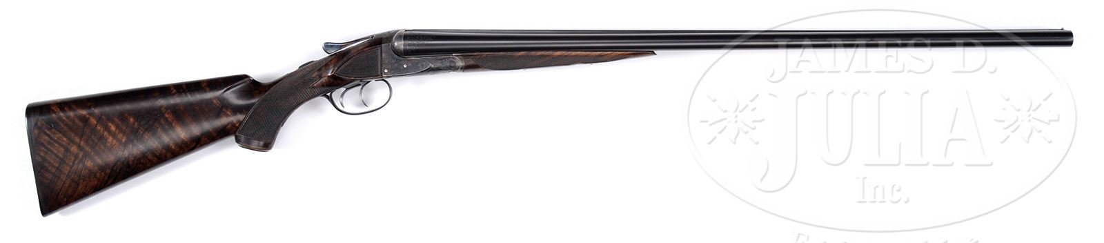 *UNUSUAL 16 GAUGE A. H. FOX CE.SN 302383. Cal. 16 ga. 2-1/2″ Chambers. 28″ Bbls with semi-raised, matted rib are marked “CHROMOX FLUID COMPRESSED STEEL” and “MADE BY A.H. FOX GUN CO. PHILA. PA. U.S.A.” on tops. There are 1-1/2″ triangles of scroll at breech ends. Bbl flats are stamped with SN, grade, and Fox proof. Bbls are stamped with striking weight “4”. Case hardened action features automatic safety and double triggers. It is engraved in typical “C” style with 70% coverage of scroll within line and vine borders surrounding oval vignettes of birds surmounted by “ANSLEY H FOX” on sides; a pair of quail on left, snipe on right. Bottom of action portrays a setter with mountains in background. Blued trigger guard has scrolled banner on bow, and SN on tang. Beautifully marbled and strikingly fiddle figured European walnut Fox capped pistol grip buttstock measures 14″ over serrated composition buttplate. Side panels are checkered and have beaded borders. Point pattern checkering with beaded borders is at grip. Matching splinter ejector forend has inset horn tip and typical Deeley type release. Bore diameter: left -.661, right -.660. Bore restrictions: left -.028 (full), right -.015 (Mod). Minimum wall thickness: left -.029, right -.028. Drop at heel: 3-1/16″, drop at comb: 1-7/8″. Weight: 5 lbs 14 oz. LOP: 14″. PROVENANCE: J. T. Callahan letter stating the gun was shipped on Mar 22, 1928, and confirming specifications. CONDITION: Excellent, near new, as competently and correctly refinished. Bbls retain essentially all of a factory quality satin rust blue with a few light marks. Action retains 98% correctly colored re-hardening, silvered a touch on fences and forend iron. Trigger guard retains essentially all of its re-blue, engraving slightly softened. Stocks retain nearly all of a fine hand rubbed oil finish over a few light marks, and with some subsequent very light handling marks. Checkering competently re-cut. Bores are excellent. Action is tight. Ejectors are strong, but slightly out of time. A scarce and desirable small bore Fox. 4-55435 (7,500-12,500) – Lot 2576 Click here to view provenance