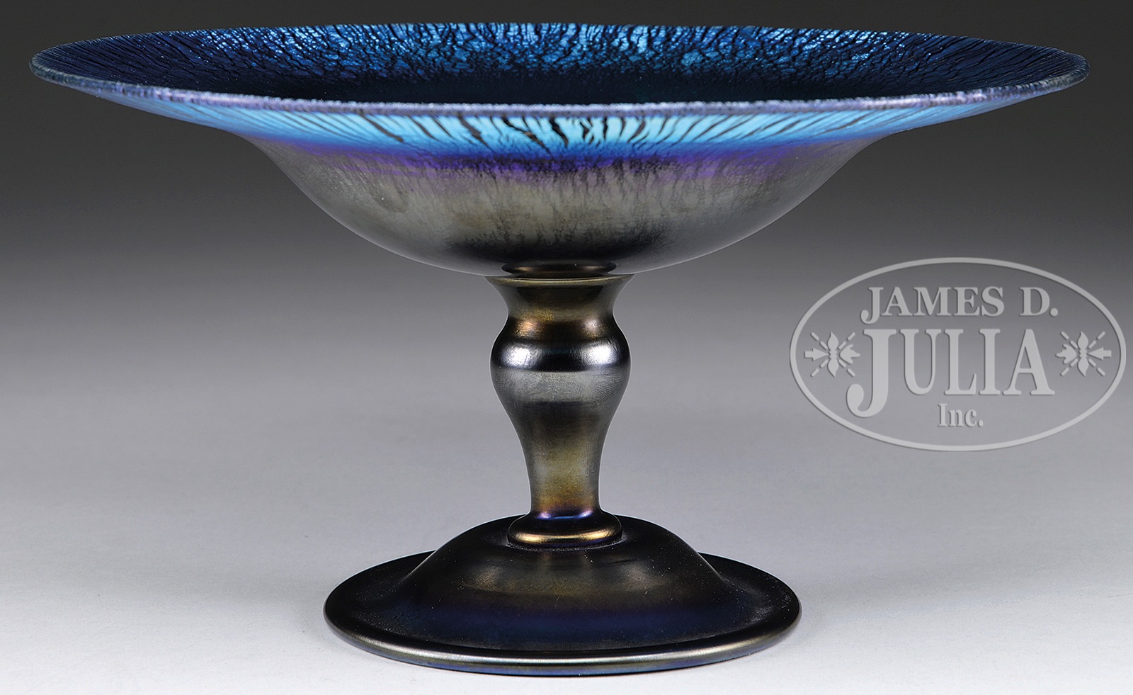 TIFFANY BLUE FAVRILE COMPOTE.Tiffany compote has bright blue iridescent finish with stretched rim and strong purple highlights. Compote is signed on the underside “L.C. Tiffany Inc. Favrile”. SIZE: 5-1/2″ t x 10″ dia. PROVENANCE: Linda Southworth Collection. CONDITION: Very good to excellent. 5-68268 (1,500-2,500) – Lot 2577