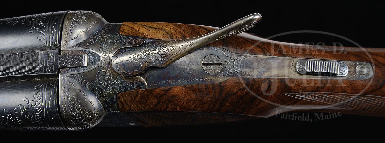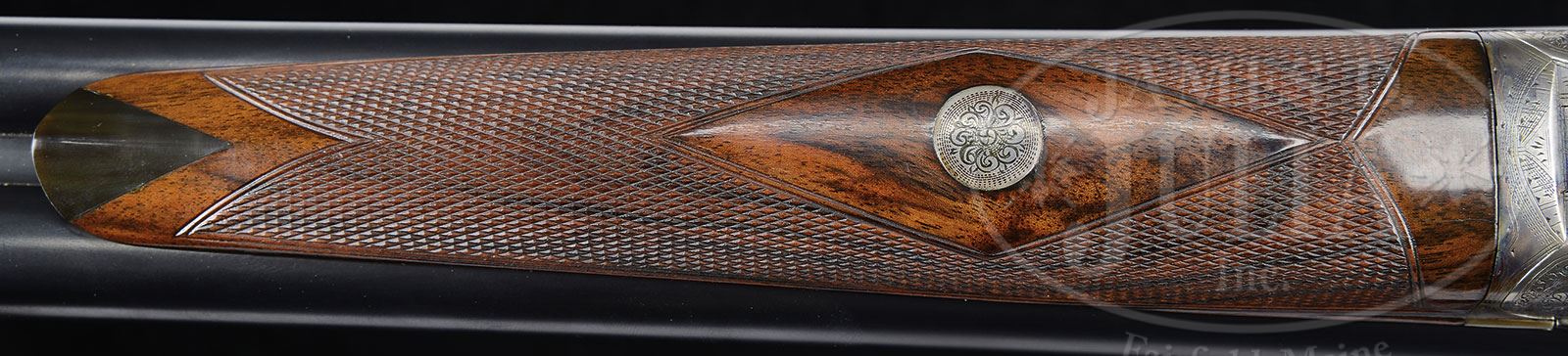 Please Note Positive: The bore diameter is .655 in the right and left barrel, not .621 as stated in the catalog. *EARLY A.H. FOX 16 GAUGE CE GRADE SHOTGUN.SN 300426. Cal. 16 ga. 26-1/8″ Bbls with slightly raised, matted rib, are marked “Krupp Fluid Steel Made By” “A. H. Fox Gun Co. Phila. PA” on tops. There are 1-3/4″ triangles of scroll engraving at breech ends. Bbl flats are stamped with SN, grade, gauge, and Fox proof. Case hardened action features automatic safety and is fitted with Kautzky single selective trigger. Action is engraved with 60% coverage varying sized scroll surrounding oval vignettes of game birds under “ANSLEY H. FOX” on both sides; quail on left, and snipe on right. A setter is in circular scene on bottom of action. Scroll engraved trigger guard has SN at grip. Newly made, nicely streaked and lightly figured European walnut capped pistol grip buttstock measures 14-1/4″ over checkered wood butt. Side panels are checkered and grip is checkered in point pattern with line borders. Orig splinter ejector forend has inset schnabeled horn tip and circular screw boss in central diamond of checkering. Bore diameter: left -.612, right -.612. Bore restrictions: left -.013 (Mod), right -.003 (Skeet). Minimum wall thickness: left -.038, right -.035. Drop at heel: 1-7/8″, drop at comb: 1-7/16″. Weight: 6 lbs 10 oz. LOP: 14-1/4″. CONDITION: Excellent, as refurbished. Bbls retain essentially all of a fine satin re-blue, engraving softened. Action retains 90% of what appears to be orig case hardening color, engraving sharp and clear. New stock retains essentially all of its fine hand rubbed oil finish with a few light marks. Orig forend retains nearly all of a matching finish with considerable wear around escutcheon previous to refinishing, checkering nicely re-cut. Bores are excellent. Action is tight. Ejectors are slightly out of time. Trigger works. Fine affordable shooter. 4-54070 (6,000-9,000) – Lot 2577
