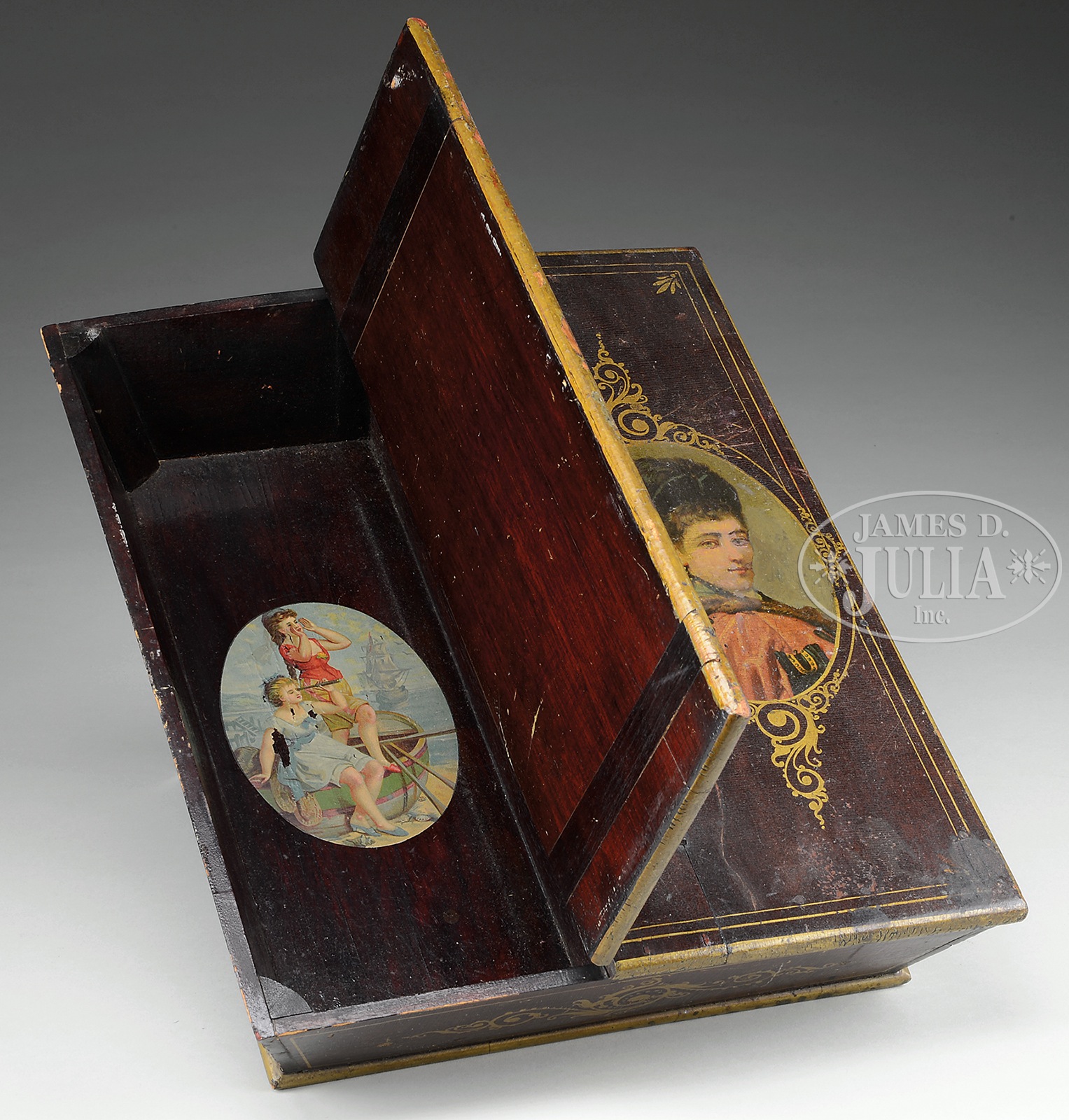LADY’S DOUBLE SIDED LIFT TOP NECESSARY BOX.Late 19th century, American. Walnut vanity box with tall cutout handle having two sloping side lids of splined construction covering compartments in a splayed side vanity box decorated on lids with portraits of Victorian women within gilt scroll cartouches. The entire box decorated with gilt pinstripes and scrolling elements. SIZE: 7″ h, 15″ l, 12″ d CONDITION: Very good with wear commensurate with age. 9-93223 (800-1,200) – Lot 2580