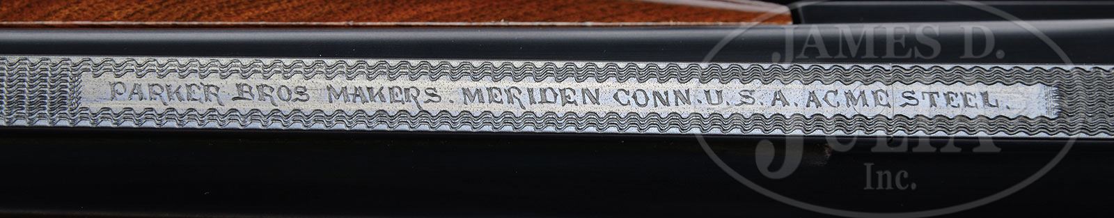 Please Note: Pre-ban ivory bead sight. Special Note: This item contains or is made of ivory. Do not bid on this lot unless you have read and agreed to our “Ivory Position Statement” and the “Waiver of Legal and Financial Risk to James D. Julia in regards to your Purchase of an Ivory Object“. This information is located in our catalog on pages 30 and 31. *RARE PARKER A GRADE SINGLE BARREL TRAP.SN 183224. Cal. 12 ga. 2-3/4″ Chamber. One of only 5 made with 34″ bbl in this grade. Bbl is marked with Parker Bros Meriden CT address with “ACME STEEL” on raised ventilated rib. Case hardened action has nicely filed beads along water table, and onto standing breech. Trigger is gold-plated. Action is engraved with near full coverage various sized simple scroll with small scroll and geometric borders. “PARKER BROS” is in attenuated scrolled banner on each side. Trigger guard with scroll engraved bow has SN at grip. Nicely crotch figured American walnut Parker capped pistol grip buttstock measures 14-1/2″ over Silver type pad, and features Monte Carlo comb, checkered side panels with fleur-di-lis drop points, and typical A grade fancy patterned checkering with mullered borders and flourishes toward comb at grip. Matching long beavertail forend has reinforcing bolt, typical release, and ejector patents on iron. Gun matches most specifications in PARKER IDENTIFICATION & SERIALIZATION ledger, except it is listed as having a straight hand stock. Bore diameter: .734. Bore restrictions: .038 (full). Minimum wall thickness: .079. Drop at heel: 2″, drop at rear of Monte Carlo: 1-3/8″, drop at comb: 1-3/8″. Weight: 8 lbs 10 oz. LOP: 14-1/2″. PROVENANCE: The Steven Harris Collection. CONDITION: Excellent, near new, as completely restored, retaining essentially all of its custom finishes on wood and metal, with only the lightest of handling marks found. Mechanically crisp. 4-55071 (6,000-10,000) – Lot 2580