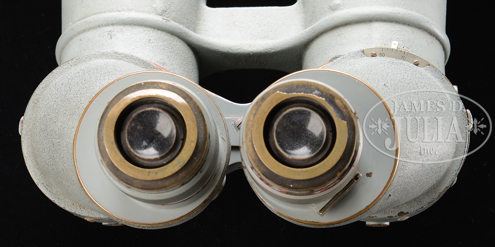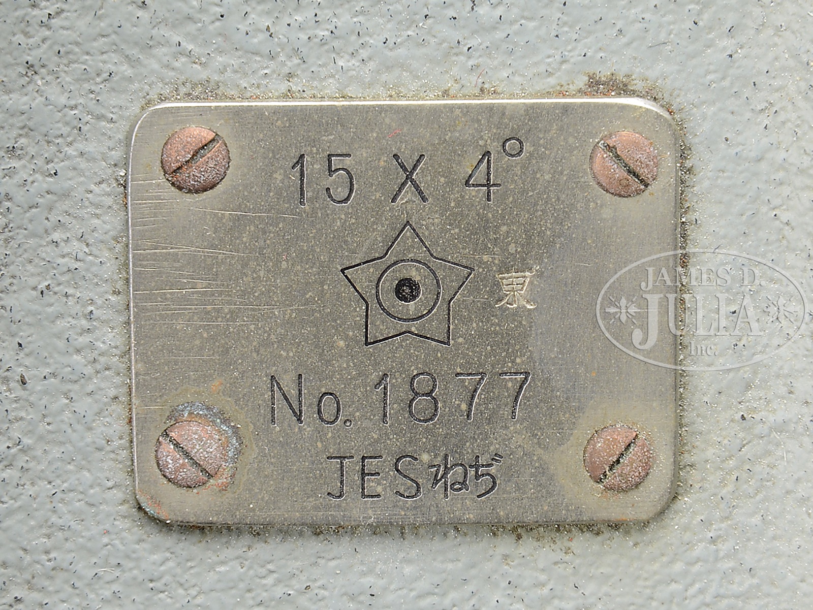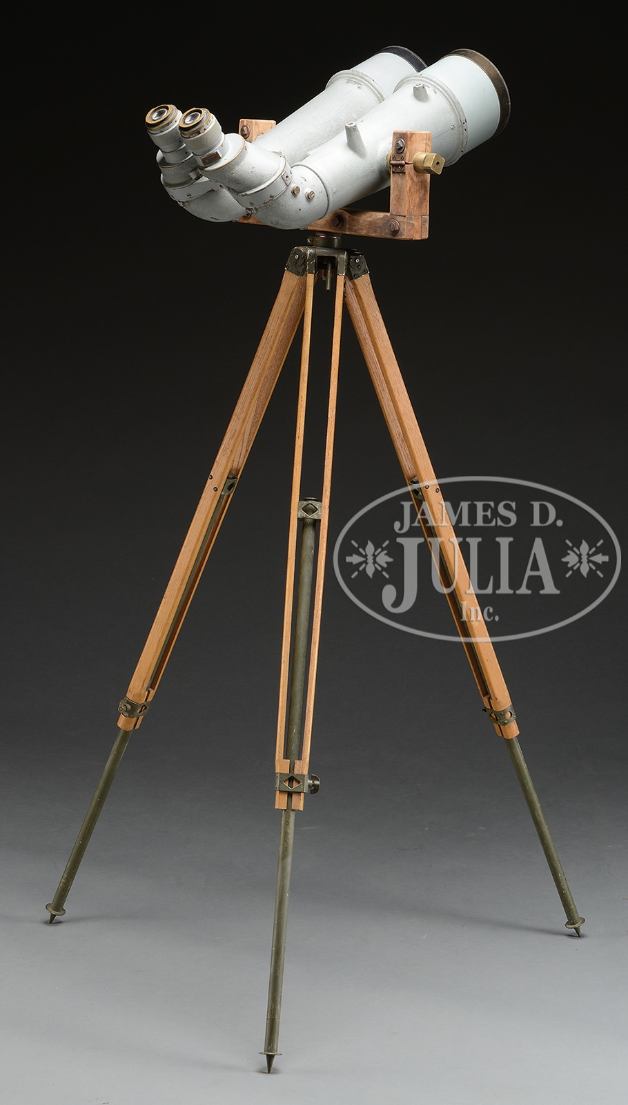 PAIR OF WWII JAPANESE SHIP’S BINOCULARS ON TRIPOD BASE.The large aqua painted binoculars with Japanese writing mounted for a tripod base made of wood and metal. Large brass lens caps present. Plaque marked “15 x 4 x 4 No. 1877 JAES”. SIZE: Binoculars: 20″ l. Tripod: 55″ h extended. Tripod: 31″ h collapsed. PROVENANCE: Sloans & Kenyon, December 12, 2014, lot 628. CONDITION: Optics intact. Very good. 49857-1 (800-1,200) – Lot 2582