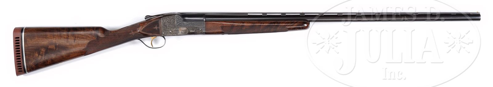 Please Note: Pre-ban ivory bead sight. Special Note: This item contains or is made of ivory. Do not bid on this lot unless you have read and agreed to our “Ivory Position Statement” and the “Waiver of Legal and Financial Risk to James D. Julia in regards to your Purchase of an Ivory Object“. This information is located in our catalog on pages 30 and 31. Please note: Great news! This is one of three Ithaca Grade 6 Knick SBT’s made. It is an exceptionally rare gun. *RARE ITHACA GRADE 6 SINGLE BARREL TRAP GUN.SN 400025T. Cal. 12 ga. 2-3/4″ Chamber. 32″ Bbl with raised, matted, ventilated rib is engraved “Ithaca Gun Co” and “Ithaca N.Y. U.S.A.” in arched ribands surrounded by large acanthus leaves with stippled backgrounds on each side. Engine turned bbl flats are engraved with SN and grade. This acanthus treatment extends to case hardened action where it surrounds gold and silver inlaid target vignettes; a gold Indian with silver hair, breech clout and arrow, draws bow in open woodlands on left, and a gold trap shooter with silver pants is shooting at trap range on right. Bottom of action is engraved with heraldic eagle which is over “MADE IN” “U.S.A.” More acanthus is on trigger guard bow. SN is on grip. Trigger is gold-plated, with finger blade checkered. Water table is engraved with SN, “12”, and “6”. Feather crotch figured American walnut buttstock measures 14-1/2″ over open sided HAWKINS pad with 1/8″ aluminum spacer. Side panels and grip are checkered with fancy fleur-di-lis pattern. A vacant gold shield is on toe line. Matching large reverse tapered beavertail ejector forend has reinforcing bolt, Anson Deeley type secondary release, and inlet ebony tip. Bore diameter: .737. Bore restriction: -.039 (full). Minimum wall thickness: -.032. Drop at heel: 1-5/8″, drop at comb: 1-1/2″. Weight: 8 lbs 7 oz. LOP: 14-1/2″. PROVENANCE: The Steven Harris Collection. CONDITION: Excellent, as partially refinished. Bbl retains 95%+ orig blue, silvered on sharp edges, with some light marks. Action retains a considerable amount of what appears to be its orig case hardening color, chemically darkened. Trigger guard retains 85 – 90% of its orig blue, silvered on edges of bow and at grip. Stocks retain nearly all of an old oil finish, with a few light marks, checkering re-cut. Pad is new. Bore is excellent. Action is tight. Ejector works. 4-55079 (5,000-8,000) – Lot 2585