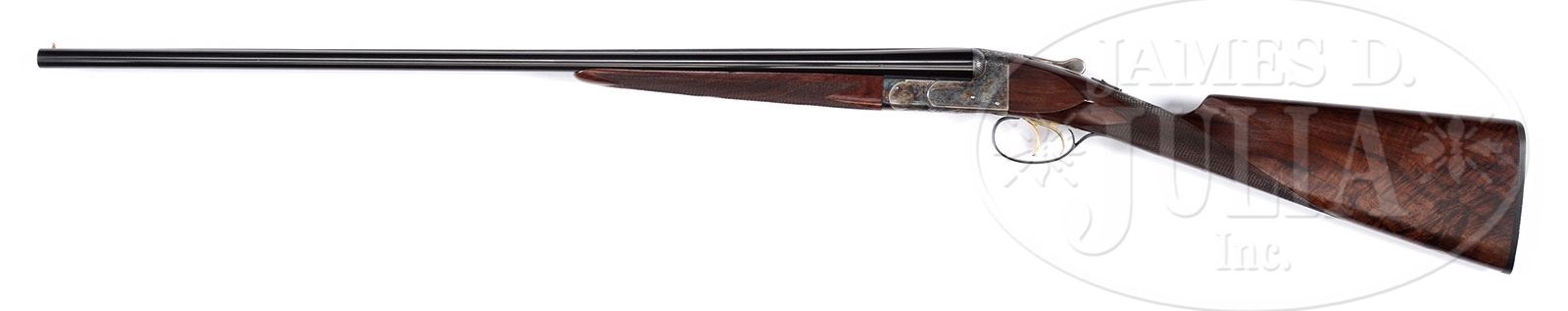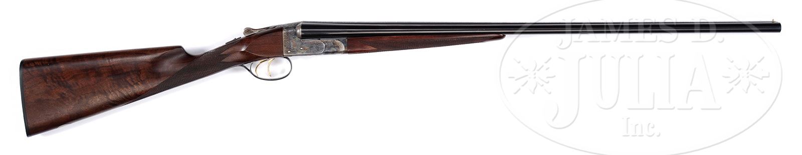 *SCARCE 28 GAUGE ITHACA CLASSIC DOUBLES 4E.SN 470059. Cal. 28 ga. 28″ Bbls with matted game rib are stamped with SN and 2001 Italian nitro proofs on bbl flats. Typical boxlock Ithaca action features automatic safety and gold-plated double triggers. Action is engraved with large acanthus in stippled backgrounds surrounding scenes of game birds on each side; a duck on left, and a pheasant standing on right. Bottom of action depicts a woodcock. Ithaca classic doubles information is on water table. Blued trigger guard is scroll engraved on bow, and has SN on tang. Nicely stump figured American walnut straight grip buttstock measures 14-1/2″ over serrated composition buttplate. Point pattern checkering with line borders is at grip. A vacant silver oval is on toe line. Matching splinter ejector forend has contrasting wood tip, and J-spring release with Deeley type secondary latch. Bore diameter: left -.550, right -.551. Bore restrictions: left -.018 (mod), right -.018 (mod). Drop at heel: 2-1/4″, drop at comb: 1-3/8″. Weight: 6 lbs 4 oz. LOP: 14-1/2″. CONDITION: Excellent, showing scant evidence of limited field use, with a few handling marks on bbls. Sharp edges of action are slightly silvered. Stocks have a few light marks. Bores are excellent. Mechanically crisp. 4-55326 (4,000-6,000) – Lot 2590