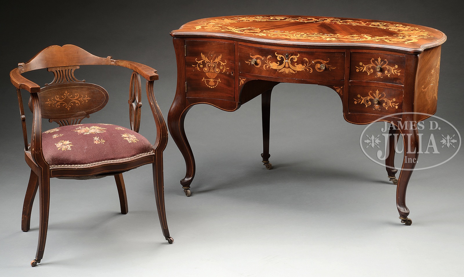 FINE BENCHMADE MARQUETRY WRITING DESK WITH ASSOCIATED ARMCHAIR.Late 19th century, George C. Flint Company, New York. Kidney shaped desk in the Louis XV taste fitted with bowfront central drawer, flanked by a concave door opening to interior fitted with filing slots and a bank of 2 short drawers with concave fronts, raised on cabriole legs terminating in pad feet raised on brass capped casters. Writing surface adorned with marquetry floral vinery and cornucopia. Central drawer with marquetry opposing fanciful serpents, door with floral filled urn, short drawers with floral sprays. Finished back of desk profusely decorated with floral filled urns and scrolling vinery on each panel. Label of George C. Flint Company, West 23rd Street, NY affixed to underside of desk. Desk finished with custom shaped plate glass protective top. Desk is accompanied by a marquetry armchair of art noveau design featuring an inlaid back panel, arms on cabriole supports centering upholstered needlepoint seat of floral design. SIZE: Desk 31-1/2″ h x 45-1/2″ w x 27-1/2″ d. Chair 30-1/2″ h (back) x 22-1/2″ w x 16-1/2″ h (seat). CONDITION: Desk and chair very good, with original surface and needlepoint seat. Door on desk missing escutcheon. 49713-1 (700-900) – Lot 2591