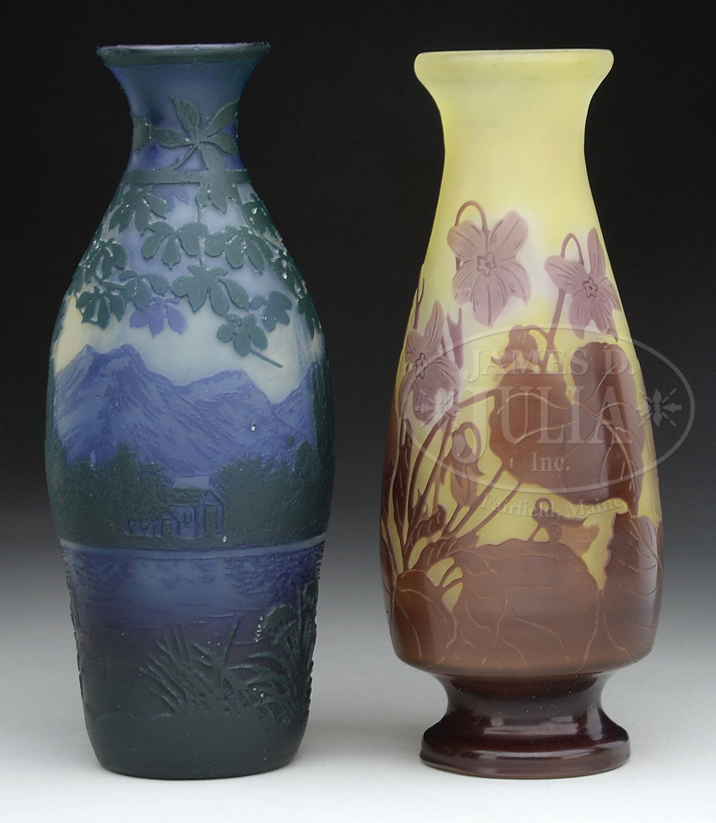 TWO FRENCH CAMEO GLASS VASES.1) Galle vase has brown cameo leaves rising from foot leading to light lavender cameo flowers all set against frosted pastel yellow background. Signed on side in cameo “Galle”. 2) de Vez vase has green cameo leaves and vines descending from neck above blue cameo lake with green trees and cabin on distant shore. Rugged blue cameo mountains can be seen in distance. All against cream colored background. Signed on side in cameo “de Vez”. SIZE: Both 6-3/4″ t. CONDITION: de Vez vase has some minor acid burns on lip, otherwise very good to excellent. Galle vase has some light grind marks to bottom edge of foot, otherwise very good. 50334-2 (1,000-1,500) – Lot 2592
