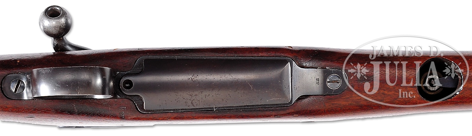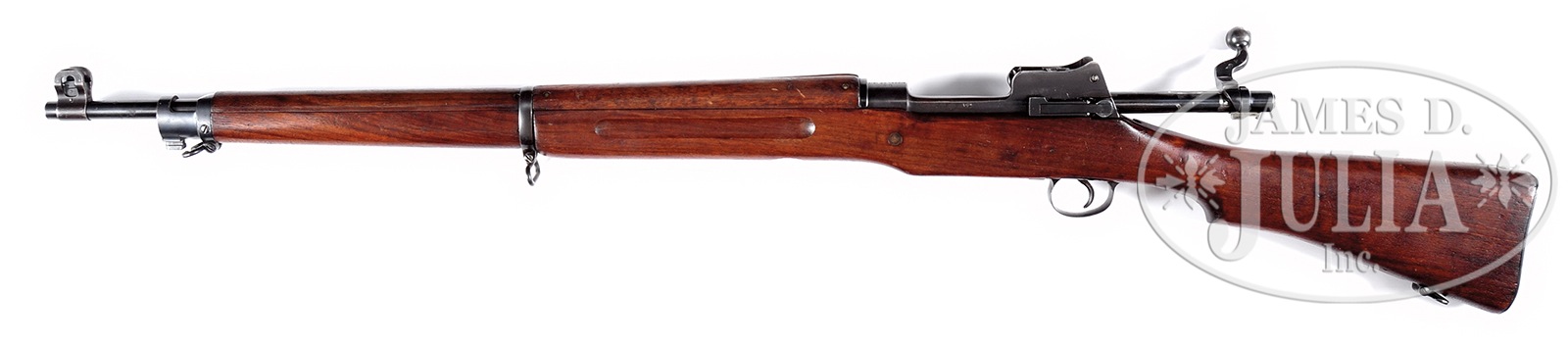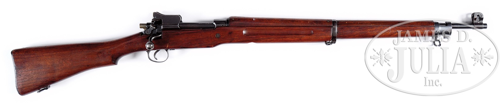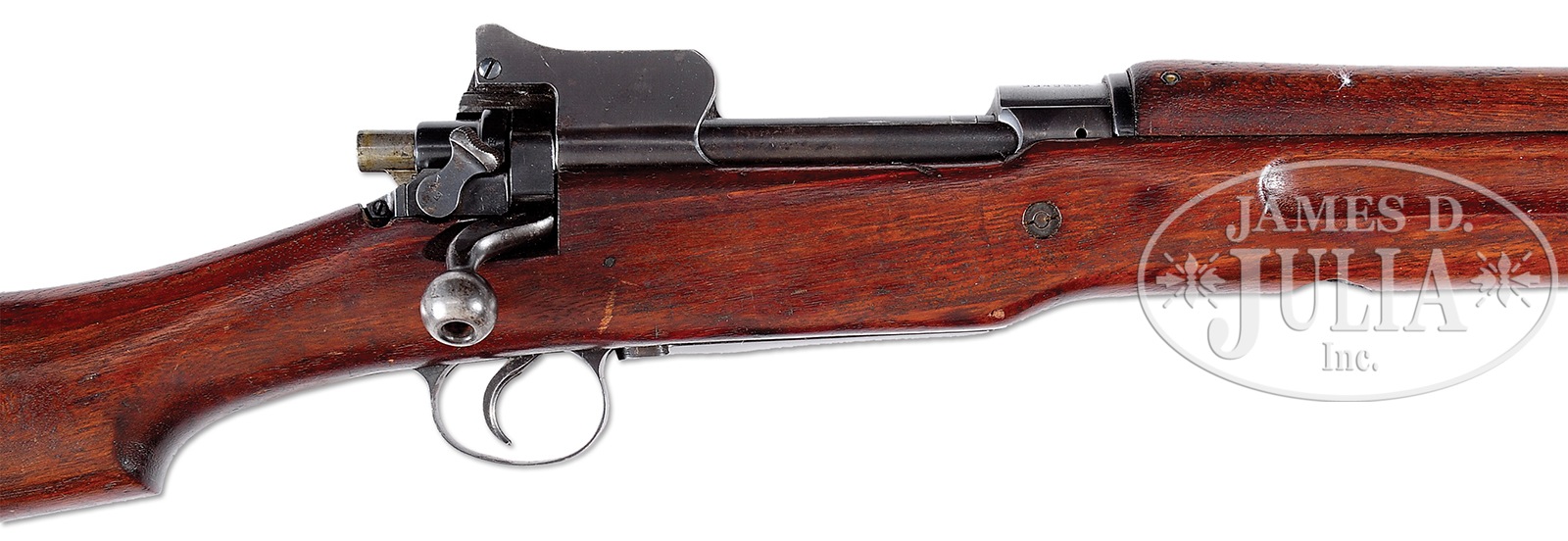 *RARE REMINGTON MODEL 1917 ENFIELD BOLT ACTION MILITARY RIFLE WITH UNUSUAL ATTACHMENT ON BOTTOM OF BARREL.SN 334958. Cal. 30-06. Outwardly appearing standard rifle with 26″ rnd bbl with Remington and flaming bomb marks by the front sight and the date “5-18”. Chamber area of the bbl, under the handguard is marked with two large and two small Springfield eagles and a large Ordnance Corps flaming bomb. Bottom of the bbl, under the stock has a very strange attachment which appears to be a gas port or pressure test device with a small floating piston inside retained by flat spring. Piston protrudes into the bore, effectively blocking it. Receiver ring has standard Remington markings and SN with two Springfield eagle stamps over “F 1” and “F 2”. Mounted in a standard 1-pc walnut stock with grasping groove forestock and smooth steel buttplate with trap containing a braided string and brass pull-through. Bottom rear of the forestock has a 1-1/8″ rnd hole aligned with this “gas port” and inside has relief cuts for the spring and screws. Buttstock has a Springfield eagle stamp just forward of the floorplate, otherwise appears to be unmarked. Accompanied by an orig Remington 1917 dated bayonet with wood handles and orig scabbard that has green leather body and steel throat and tip. PROVENANCE: The William Smith Collection. CONDITION: Very fine. Overall retains about 95% strong orig blue, with only light wear on the bbl. Trigger guard and floorplate retain about 98% orig blue and the buttplate about 75%. Wood is sound with a few light handling and storage nicks and scratches and retains most of its orig oil finish. Mechanics are fine. Bore is effectively blocked and condition could not be determined. Bayonet and scabbard are fine. 49953-14 C&R (1,500-4,500) – Lot 2596
