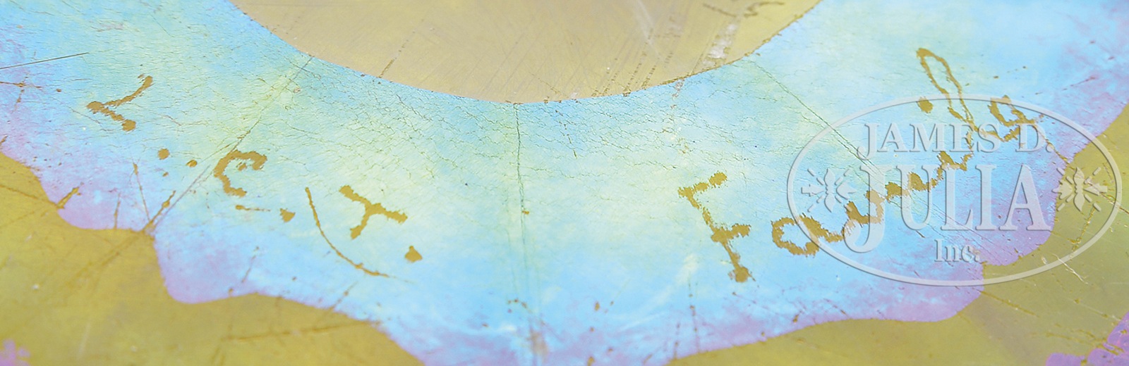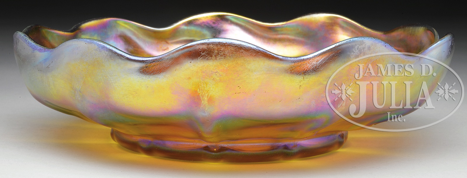 TIFFANY FAVRILE BOWL.Tiffany gold favrile bowl has vertically ribbed sides with ruffled rim. Bright gold iridescence shows strong pink and green highlights. Signed on bottom “L.C.T. Favrile”. SIZE: Bowl: 9-1/4″ dia. CONDITION: Considerable wear and scratching to iridescence on interior of bowl. 5-68255 (200-400) – Lot 2601